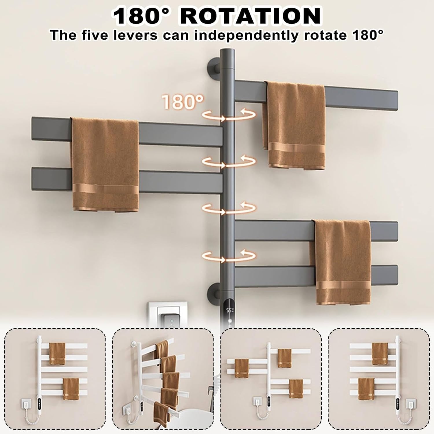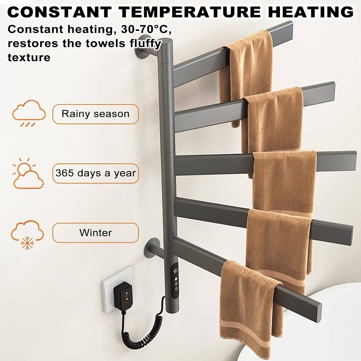 Introducing our modern wall-mounted towel warmer, designed to enhance your bathroom experience while maximizing space. This towel warmer features five innovative square bars that rotate 180°, ensuring your towels are always within reach and perfectly warmed. Equipped with an adjustable timer that ranges from 1 to 9 hours and a convenient LED indicator, this towel warmer allows for customizable heating tailored to your schedule. Imagine stepping out of the shower and wrapping yourself in a luxuriously warm towel, creating a spa-like experience in the comfort of your own home. Crafted from high-quality stainless steel, this towel warmer not only provides functionality but also adds a sleek, elegant touch to any bathroom decor. The electrostatic powder coating ensures longevity and resistance to moisture, making it an ideal choice for daily use. Detailed Information: - Product Name: Heated Towel Rack - Material: Stainless Steel - Heating Method: Carbon Fiber Dry Heating - Surface Finish: Electrostatic Powder Coating - Size: 42cm W x 66cm H x 9cm from Wall (16.53 x 25.98 x 3.54in) - Power Cord Length: 1.2m/4ft - Temperature Control: 30-70°C - Power Timer: 1-9 hours Packing List: 1 x Towel Warmer Rack 1 x Manual Please note: Minor measurement errors may occur due to manual measurement. Actual product colors may vary slightly depending on your monitor settings. Elevate your daily routine with our towel warmer, a perfect blend of style and practicality, designed to bring warmth and comfort to your home.