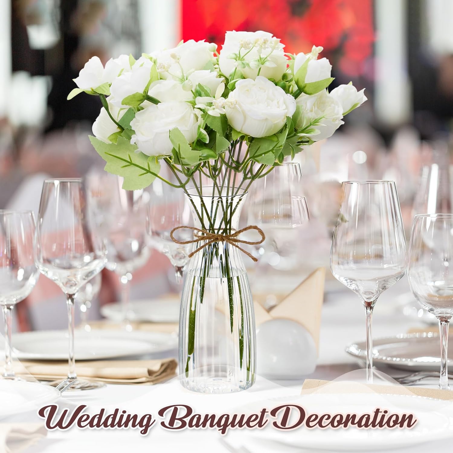 Features: These faux silk peony bouquet are ideal for a wide range of occasions, including weddings, birthday parties, graduations, bridal showers, baby showers, and festive seasons like Mother's Day and Thanksgiving. Create an enchanting atmosphere effortlessly and enjoy the romance these silky peonies bring into your life! Our artificial peony flowers bring the beauty and charm of genuine flowers into your space without the hassle of weekly maintenance or the dread of wilted leaves. The artificial peony flowers create a romantic, refreshing aesthetic with their lifelike appearance craftsmanship. Specifications: Material: silk cloth, plastic Color: white Size: Flower stem length approx. 11.81 inches/ 30 cm. Flower head diameter approx. 2.36 inches/ 6 cm. Vase dimensions approx. 2.63 inches/ 6.69 cm high. Vase base approx. 2.36 inches/ 6 cm. Vase mouth approx. 2.17 inches/ 5.5 cm Package includes: 12 X Artificial Peony Flowers 6 X plastic transparent flower pots 1 X rope Notes: Manual measurement, please allow slight errors on size. The color may exist a slight difference due to different screen displays.