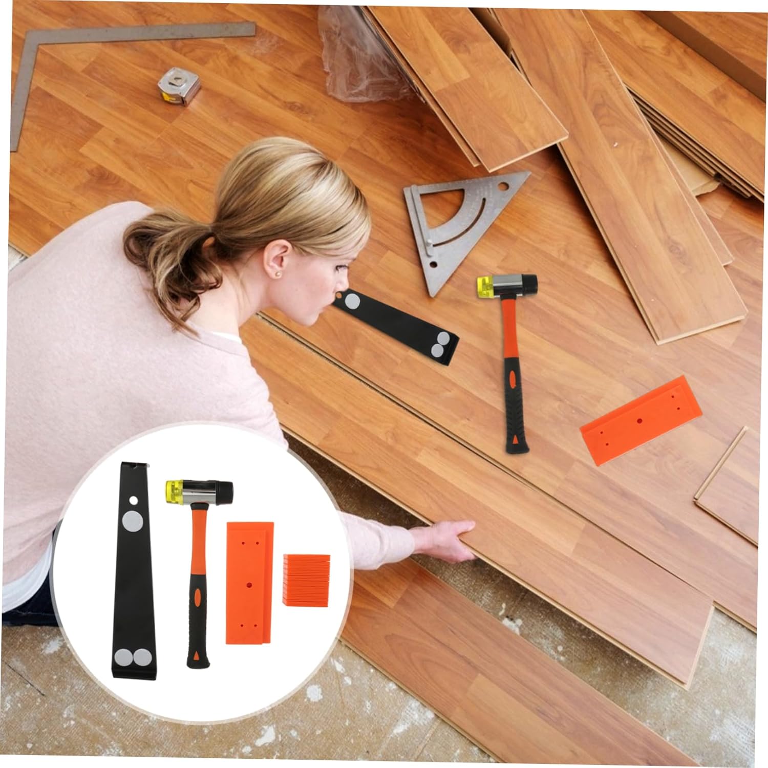 Package List spacers 1 x mallet 1 x pull bar 1 x tapping block Features -Color: Assorted Color Spacers -Size: 16.50X9.00X3.00cm/6.48X3.54X1.18in Flooring Assembly Tool -Material: plastic, carbon steel Tapping Block - Contain all the essential tools you need,making your flooring installation more convenient and easier Wedge Spacers. - Including spacers, pull bar, hammer andtapping block to satisfy your need Fiberglass Handle Mallet. - Adopt plastic and carbon steelmaterial for durable use Laminate Wood Flooring Installation Kit. - Complete tool set for vinyl plankflooring or laminate flooring installation Home Flooring Installation. - Install your new laminate or hardwoodflooring quickly, efficiently and accurately Hammer.Goods InformationWood Flooring Installation Tool This item is a laminate wood flooring installationkit.Home Flooring Installation It will provide convenience in installing vinyl plank, laminate orhardwood flooring or strengthening floor.Professional Flooring Tool A must have tool for home orprofessional flooring