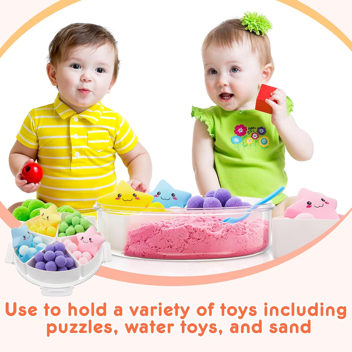 Features: The sensory bin is crafted entirely from quality materials, offering durability and longevity. Additionally, its effortless cleaning feature adds to the user's convenience, making post playtime cleanup an easy task. Our sensory bins for toddler crafts offer 5 compartments, opening up an array of storing and sorting possibilities. This, combined with their reliable design, mess free usage, and stackable feature, ensures an engaging and organized playtime. Specifications: Material: plastic Color: beige and white Diameter: about 11.22 inches/ 28.5 cm Height: about 3.43 inches/ 8.7 cm Package includes: 2 x Sensory bin with lid Notes: Manual measurement, please allow slight errors on size. The color may exist a slight difference due to different screen displays.