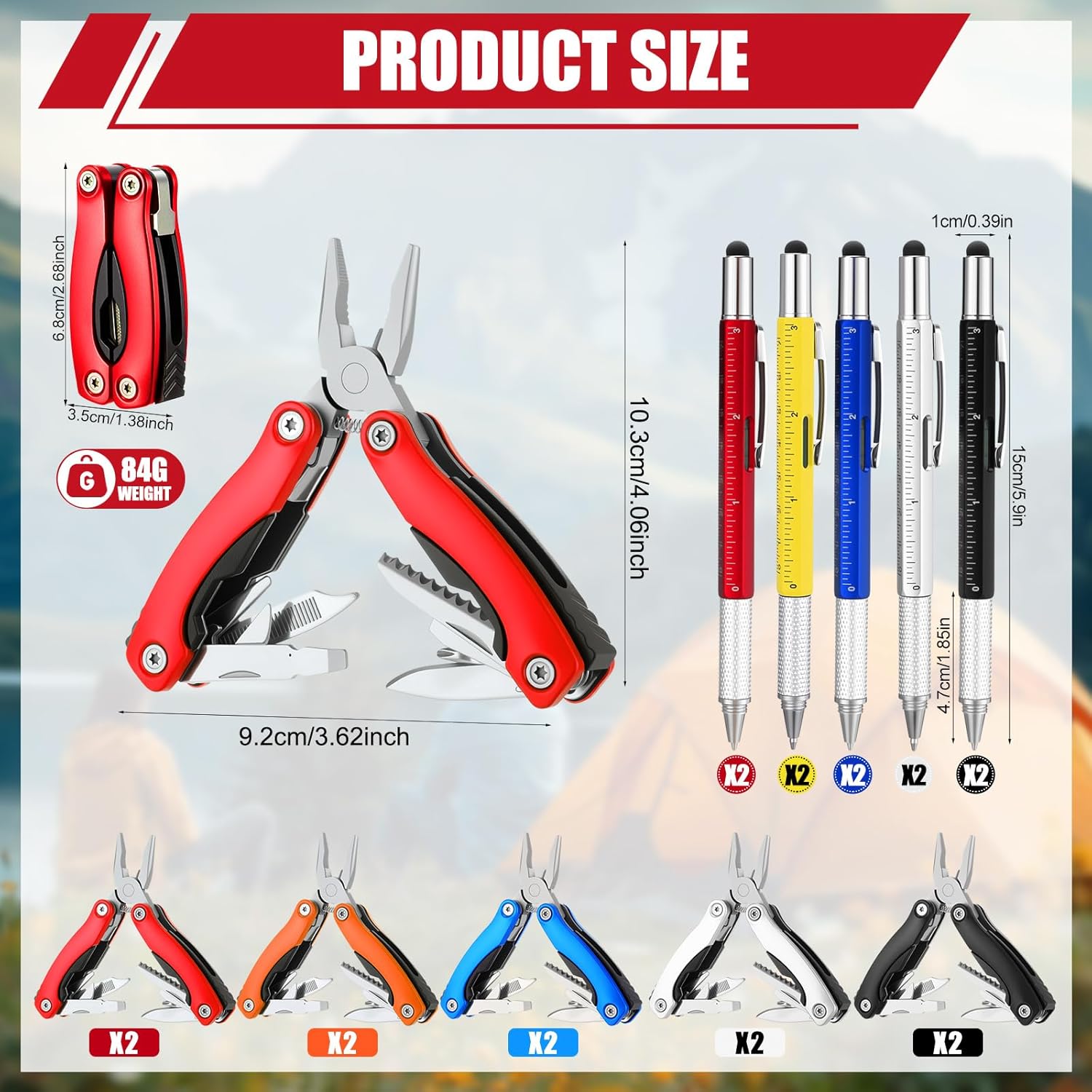 Features: Durable stainless steel construction: Crafted from stainless steel, each small multitool pliers and multi tool pen is corrosion resistant and travel ready. Compact dimensions and included 6 pieces pack make this a reliable mini multitool choice. Compact sizes for everyday carry and quick fixes: These christmas multitool gifts bulk for men are suitable for pockets, belts or keychains, ready whenever you need a screwdriver, blade or stylus. Specifications: Material: stainless Steel Color: red, blue, silver, orange, black Size: Multitool pliers: 2.95 x 1.5 x 0.59 inches / 7.5 x 3.8 x 1.5 cm Utility pens: 5.87 x 0.43 inches / 14.9 x 1.1 cm Package includes: 10 x Multitool pliers 10 x Utility pens Notes: Manual measurement, please allow slight errors on size. Color may exist a slight difference due to different screen displays