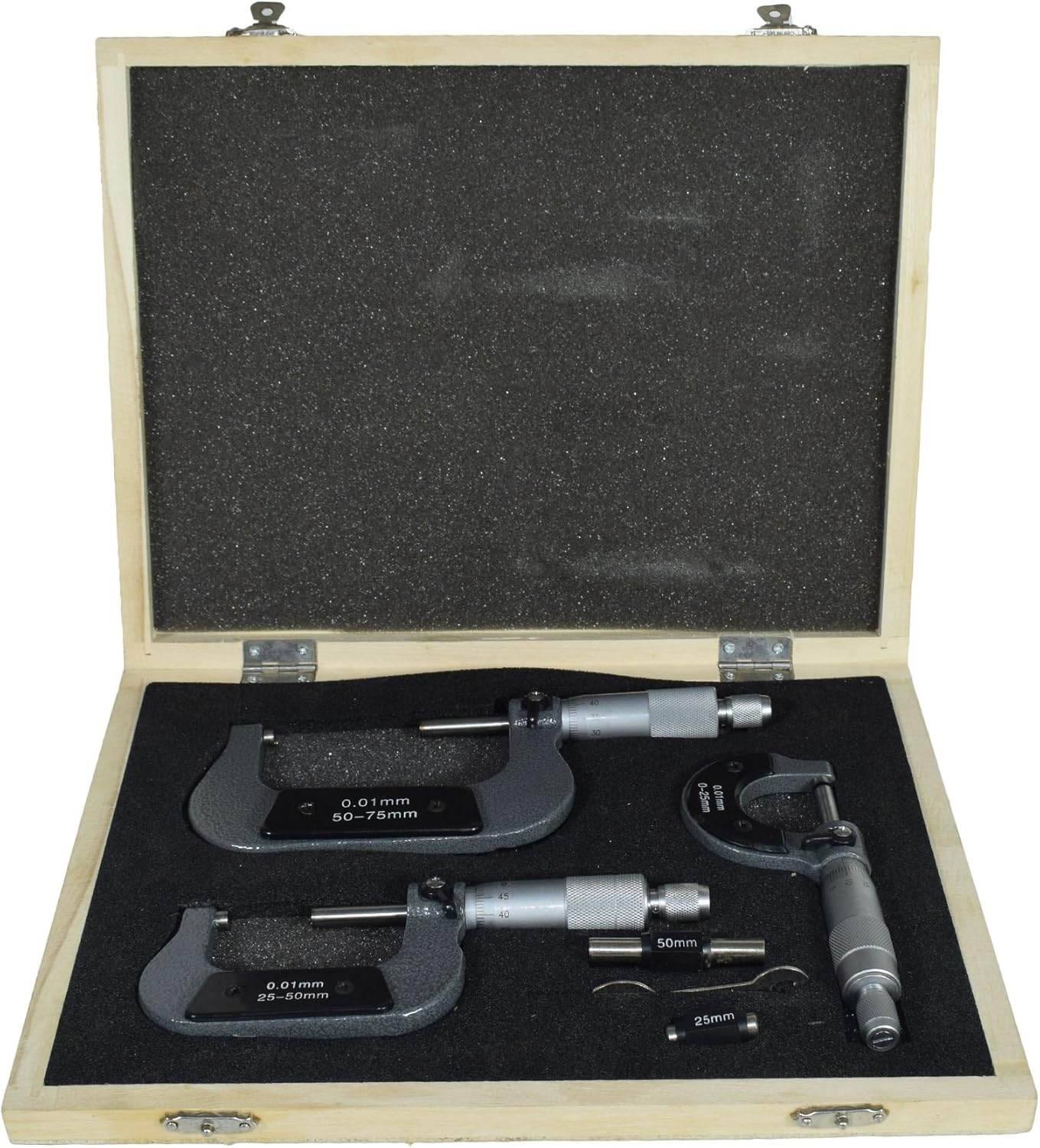Housed in a sturdy wooden case with foam insert these micrometers range from 0mm to 75mm which covers thousands of machining and engineering tasks. Precision ground anvils and superbly manufactured spindles will ensure these will be accurate and precise and prove to be an asset in any workshop. Other features include spindle ratchets and fine knurling on the main and ratchet thumbwheels, spindle locks, easy to read graduations and gauge blocks for calibration of the two larger sizes.Product Features: Measures in increments of 0.01mm Satin Chrome Finish Heat Insulated Grip Plates Standards TEST Pieces Included Carbide Tipped Anvils Expansion Grips Spindle Locks Fine Spindle RatchetsContents: Three Micrometer Sizes 0mm25mm 25mm50mm 50mm75mm Two Sizes of Gauge Blocks 25mm 50mm Service Spanner Sturdy Protective Wooden Case