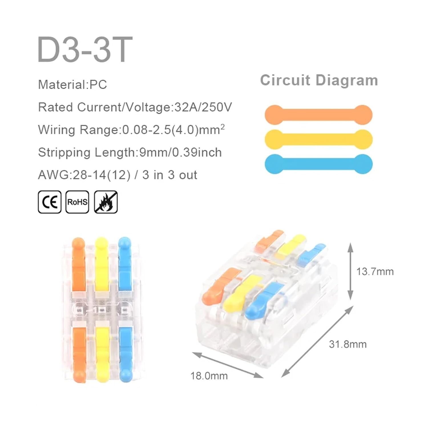 ConnectorsHign-concerned Chemical : NoneModel Number : D2-2/3Voltage : 380VOrigin : Mainland Certification : CEMaterial : PCCable Range : 0.08-2.5(4.0)mm²/28-12AWGRated Current : 32ARated Voltage : 250V