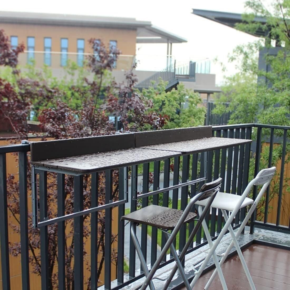 Maximize your outdoor living space with the Adjustable Folding Balcony Table, a versatile and stylish solution for patios, decks, balconies, and windows. This wall-mounted hanging table provides extra space for dining, drinks, working, or decorative use while saving room when folded. Its foldable tabletop makes storage and transport effortless, making it ideal for small spaces, picnics, or outdoor gatherings.Constructed from aluminum alloy and a waterproof technical wood tabletop, this table is built to withstand harsh outdoor conditions. It is sunproof, rustproof, and resistant to cracking and corrosion, ensuring long-term durability. The adjustable design allows the table to fit a variety of railings and heights, making it perfect for multiple applications.With a sleek wood finish, this balcony railing table combines functionality and elegance, transforming small spaces into convenient work, dining, or entertainment areas. Its 5cm high baffle keeps items secure, adding safety and practicality to your outdoor activities. Available in multiple sizes (60x37cm, 80x37cm, 100x37cm, 120x37cm) to suit your space, this table is an essential addition for compact outdoor living.Specifications:Material: Aluminum alloy + technical wood tabletopFolding Angle: 90°Adjustable Height: Up to 33cmDesktop Sizes: 60x37cm, 80x37cm, 100x37cm, 120x37cmRailing Compatibility: Square metal, square double, wooden, and round railingsPackage Includes:1 × Folding Balcony TableInstallation tools