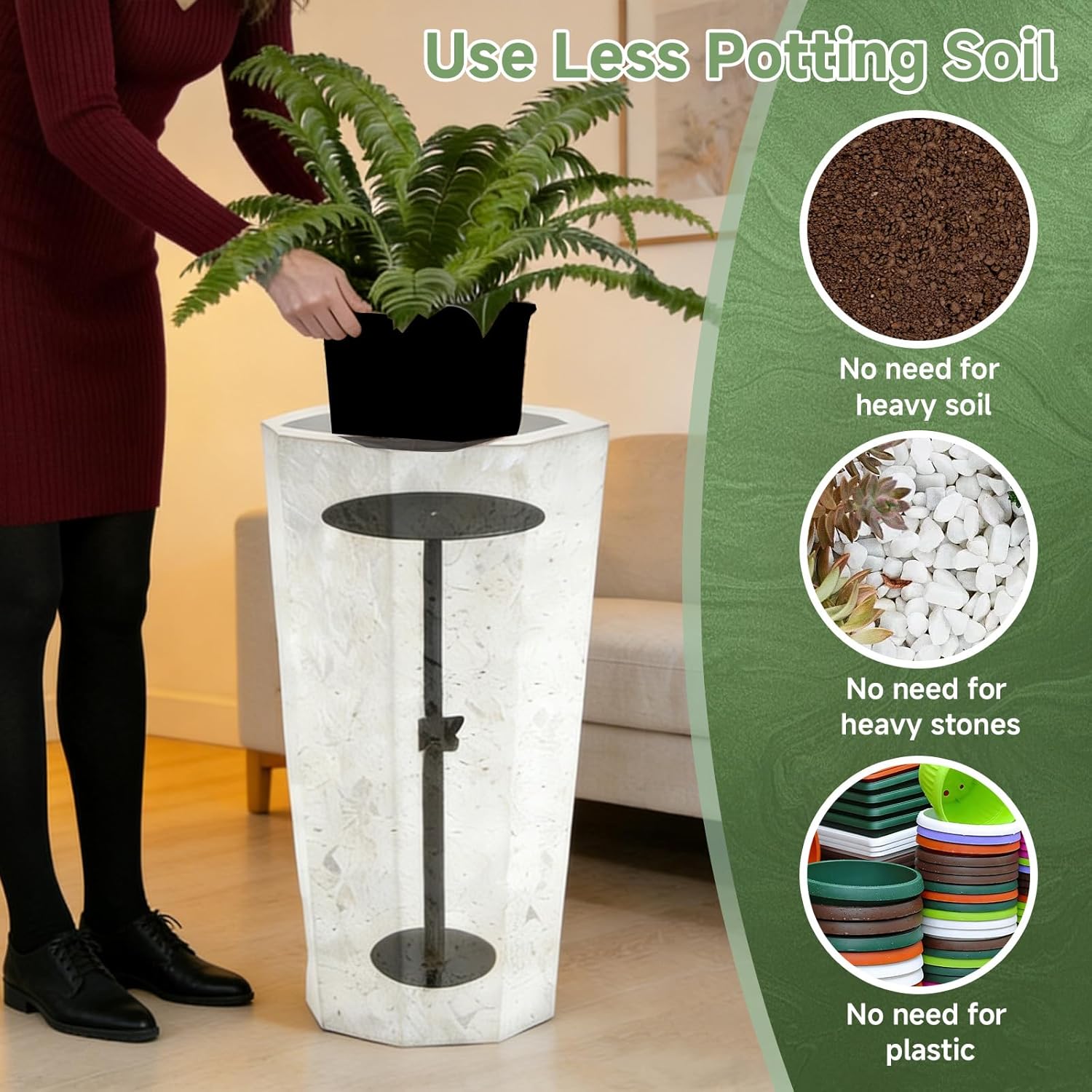 The Risirica Adjustable Plant Risers for Inside Pots have a 17-32 inch telescopic design, adapting to plant growth/seasonal changes and suiting small succulents to tall plants—fine-tune height for sunlight or decor. Made of quality carbon steel + acrylate, they support medium-weight pots, resist corrosion and include 3 acrylate trays . The soil-saving design cuts excess soil/rocks to lighten pots, easing relocation while keeping stable. Suitable for conical/square/round pots, all indoor styles ; trays enable custom setups for pot sizes, supporting safely without harming looks. Installs in minutes : connect rods to trays with screws, adjust height, lock with bolts—great for all gardeners.