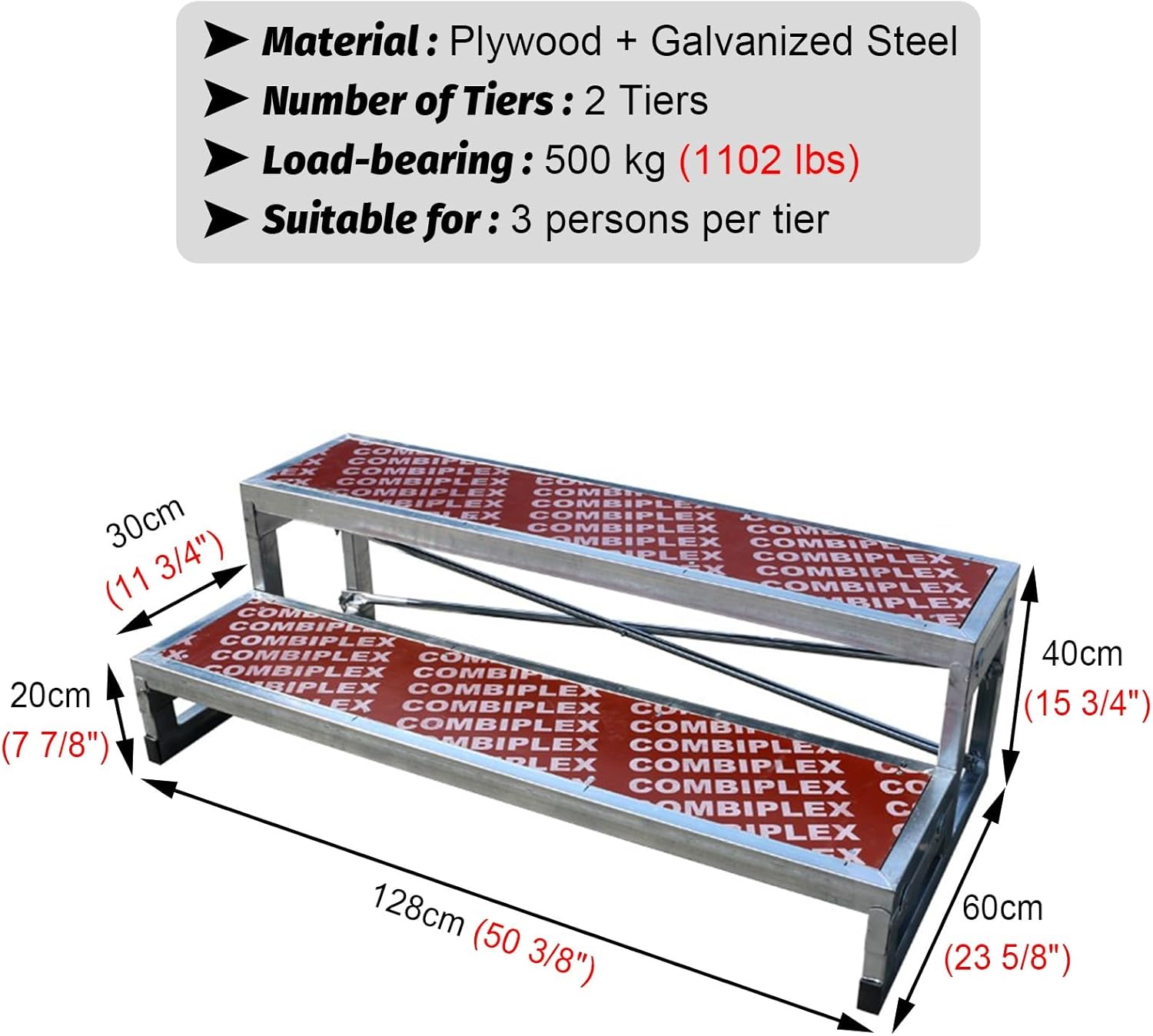 Are you in search of a dependable solution for your choir performances, group photos, or event presentations? Our Choral Risers are expertly designed to improve visibility and ensure safety during your events. Ideal for concert halls, classrooms, and theaters, these risers provide a stable platform that allows every participant to shine. **Product Highlights:** - **Sturdy Construction**: Crafted from premium plywood and galvanized steel, our risers feature an impressive load-bearing capacity, supporting up to 500 kg (1102 lbs) per tier. This durability ensures they can handle various performance needs. - **Flexible Options**: Available in 1, 2, or 3 tiers, each tier comfortably accommodates up to 3 individuals. This versatility makes them perfect for choirs, dance troupes, and other group performances, catering to various event sizes. - **Safety Focused**: With an anti-skid surface, our risers provide secure footing, giving both performers and event organizers peace of mind during shows and gatherings. - **Simple Assembly**: Designed for quick and effortless setup, our risers help you save time, allowing you to concentrate on what truly matters—your performance. - **Versatile for Any Occasion**: Whether you're organizing a commercial show, hosting an event, or capturing unforgettable group photos, our Choral Risers elevate the overall experience. **Specifications:** - Material: Plywood + Galvanized Steel - Size Options: 128 x 30 x 20 cm, 128 x 60 x 40 cm, 128 x 90 x 60 cm **Important Note**: Please be aware of minor size variations due to manual measurements. Color discrepancies may occur based on lighting and monitor settings; kindly refer to the actual product for the most accurate representation. Elevate your next event with our Choral Risers, where safety and functionality come together!