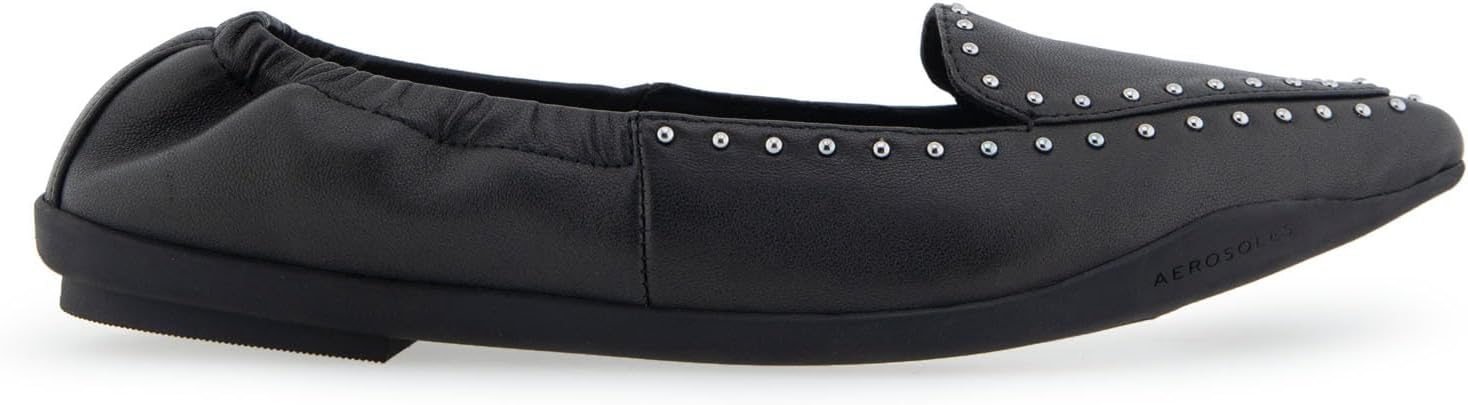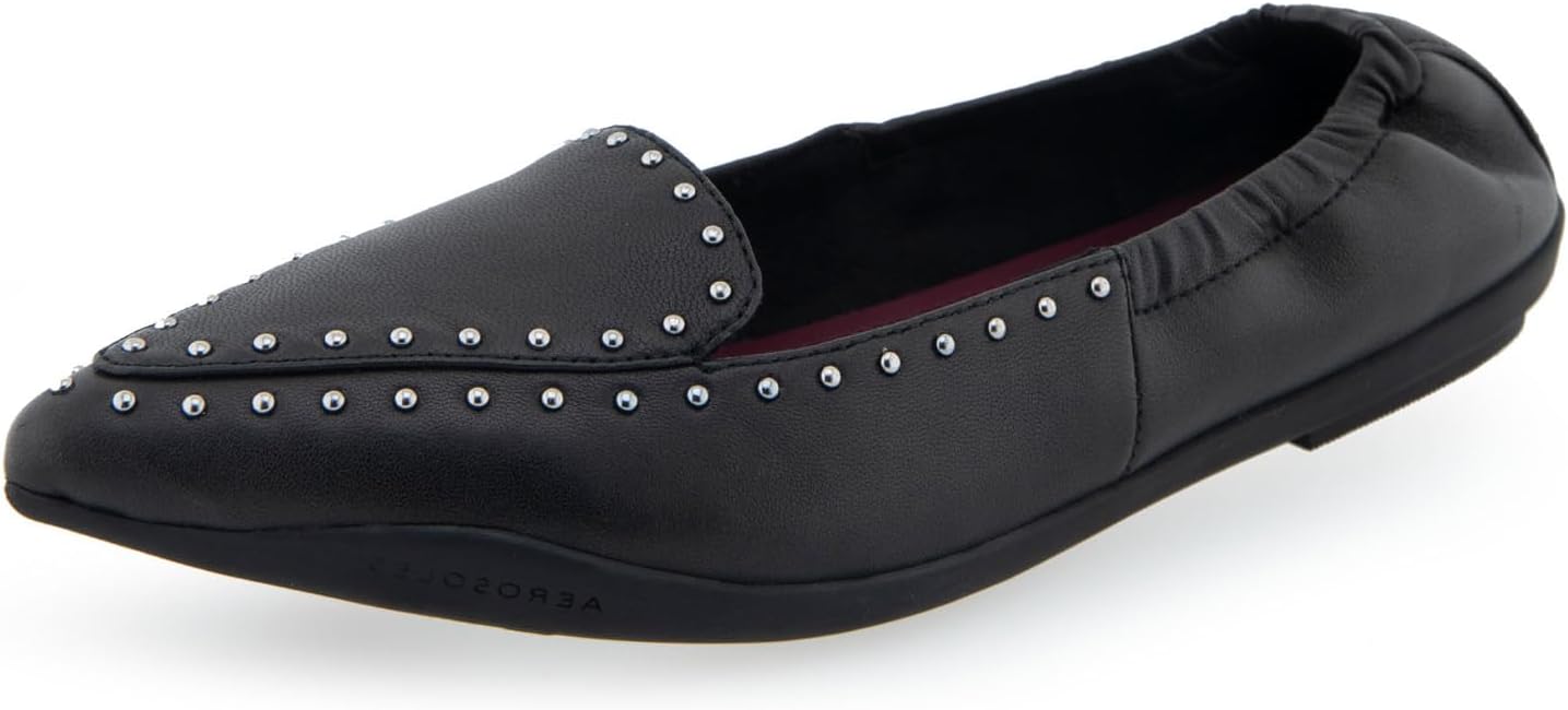 The Dee, by Aerosoles Shoes, sleek loafer is so soft and flexible, it’s like standing on clouds. These are the shoes of pop stars. Pointy-toed, studded with mini-Bombe studs for a rock’n’roll effect. Dee features a slight heel that helps with cushion and support as much as long-lasting comfort. With a soft elasticized back, these slip-on soft loafers cradle your feet. Elegant, dramatic, relaxed and chic, these loafers leave you feeling double platinum. Looks great against a wide leg trouser.