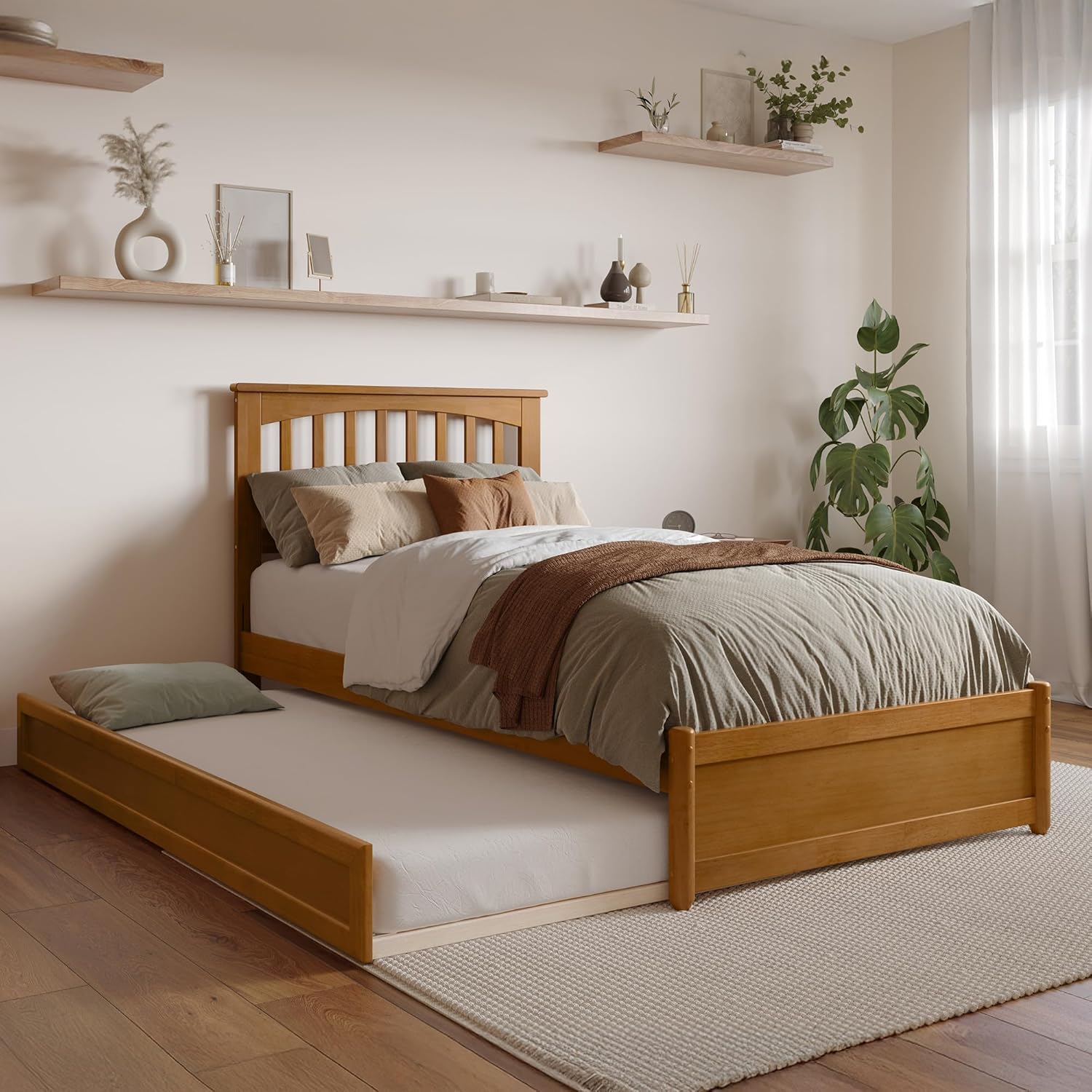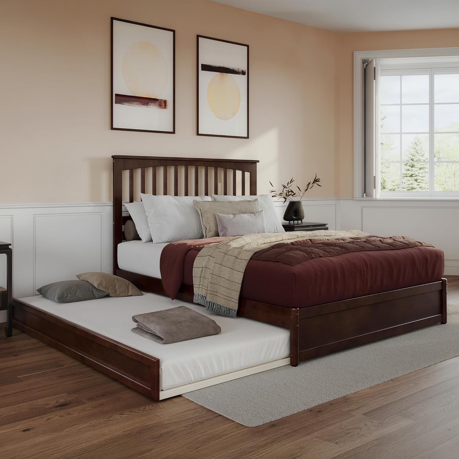 Introducing the Everett Platform Bed with Panel Footboard and Trundle, a timeless blend of style and practicality. The mission-style headboard features elegant vertical slats that perfectly complement the solid wood panel footboard, creating a cohesive and classic look. Available in versatile finishes including White, Walnut, and Light Toffee, the Everett harmonizes effortlessly with your décor. Crafted from solid hardwood and veneer, this durable platform frame includes sturdy wood slats that offer excellent mattress support and improved airflow for a cooler, more comfortable sleep without the need for a box spring. A convenient trundle smoothly glides out from beneath the bed, providing an extra sleeping space that’s perfect for guests or family. Available in Twin, Twin XL, Full, Queen, and King sizes, the Everett Platform Bed combines timeless design with everyday functionality.