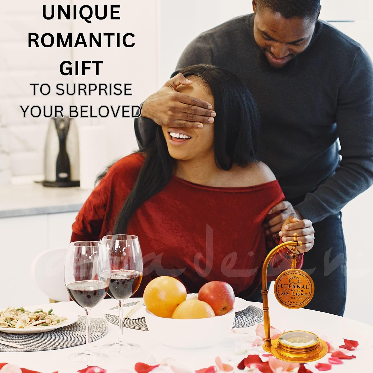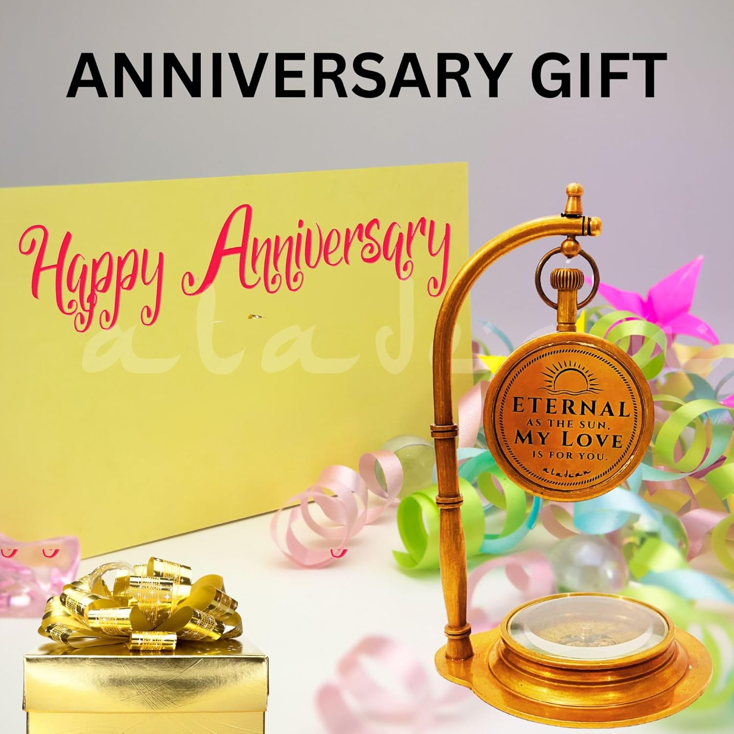 Eternal Love Neo Anniversary Table Clock Compass | Romantic Gift for Him Her Celebrate love that shines as bright as the sun with Aladean’s Eternal Love Neo Anniversary Table Clock Compass. This beautifully handcrafted brass table clock is a timeless keepsake designed to reflect the enduring nature of true love. Its vintage nautical style and functional compass make it a unique and meaningful gift for celebrating milestone moments like your 50th, 40th, 25th, or 20th wedding anniversary. The clock, measuring approximately 3.5 x 3 x 5.5 inches (8.9 x 7.6 x 14 cm), features both a 2-inch mechanical timepiece and a 2-inch functional compass, adding both practicality and elegance to any desk, shelf, or tabletop. Its sleek brass construction ensures durability, while its design is a stunning display of craftsmanship and care. What makes the Eternal Love Neo model truly special is the heartfelt quote engraved on the back: “Eternal as the sun my love is for you.” This beautiful message resonates with everlasting love and warmth, making it a perfect gift for husbands, wives, boyfriends, girlfriends, and romantic couples. It serves as a daily reminder of the strength and brightness of your relationship, a symbol of love that never fades. This versatile gift is ideal for more than just anniversaries. It’s perfect for celebrating Valentine’s Day, birthdays, housewarmings, Christmas, Thanksgiving, or any special occasion. Whether you’re giving this to a partner or gifting it to family members like sons, grandsons, nephews, or daughters-in-law, this clock will leave a lasting impression, reminding them of how much they are cherished. Key Features: Engraved Romantic Quote: "Eternal as the sun my love is for you" – a touching expression of unwavering affection and love. Handcrafted Brass Design: Durable, elegant brass with a vintage nautical aesthetic, perfect for home or office décor. Functional Compass & Clock: Both a working 2-inch compass and a 2-inch mechanical timepiece, blending sentimentality with practicality. Compact & Stylish: Sized at 3.5 x 3 x 5.5 inches, making it a beautiful display piece for any shelf, desk, or mantel. Versatile Gifting: Ideal for milestone anniversaries, Valentine’s Day, birthdays, Christmas, and more. Perfect for Loved Ones: A thoughtful gift for husbands, wives, sons, grandsons, and anyone you want to express your love for. This Eternal Love Neo Table Clock Compass is more than just a clock; it’s a symbol of love that endures forever, just like the sun. Make your next celebration unforgettable by gifting this sentimental and timeless piece to someone you love.