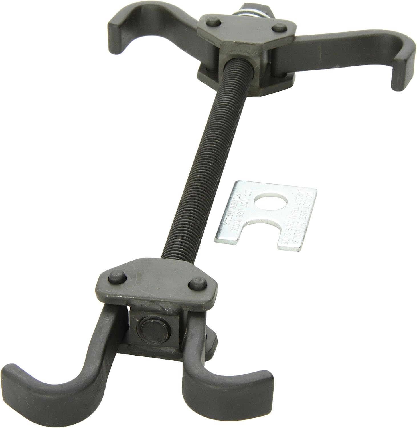 Compresses coil springs for installation and removal of springs and spacers. Strong steel jaws securely hook into coil spring. Fits most American and some imported cars and light trucks. Does not work on AMC and Ford with upper coil spring. Wear safety goggles.