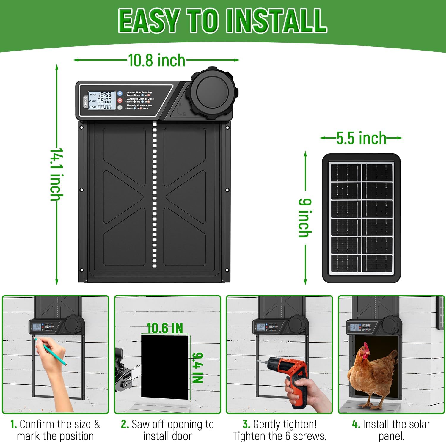 | Included Components | 1× Chicken Coop Door, 1× Solar Panel, 1× USB-C Charge Cable, 1× Screwdriver and 8 Screws |