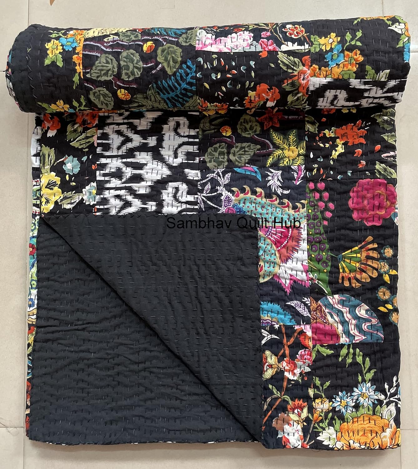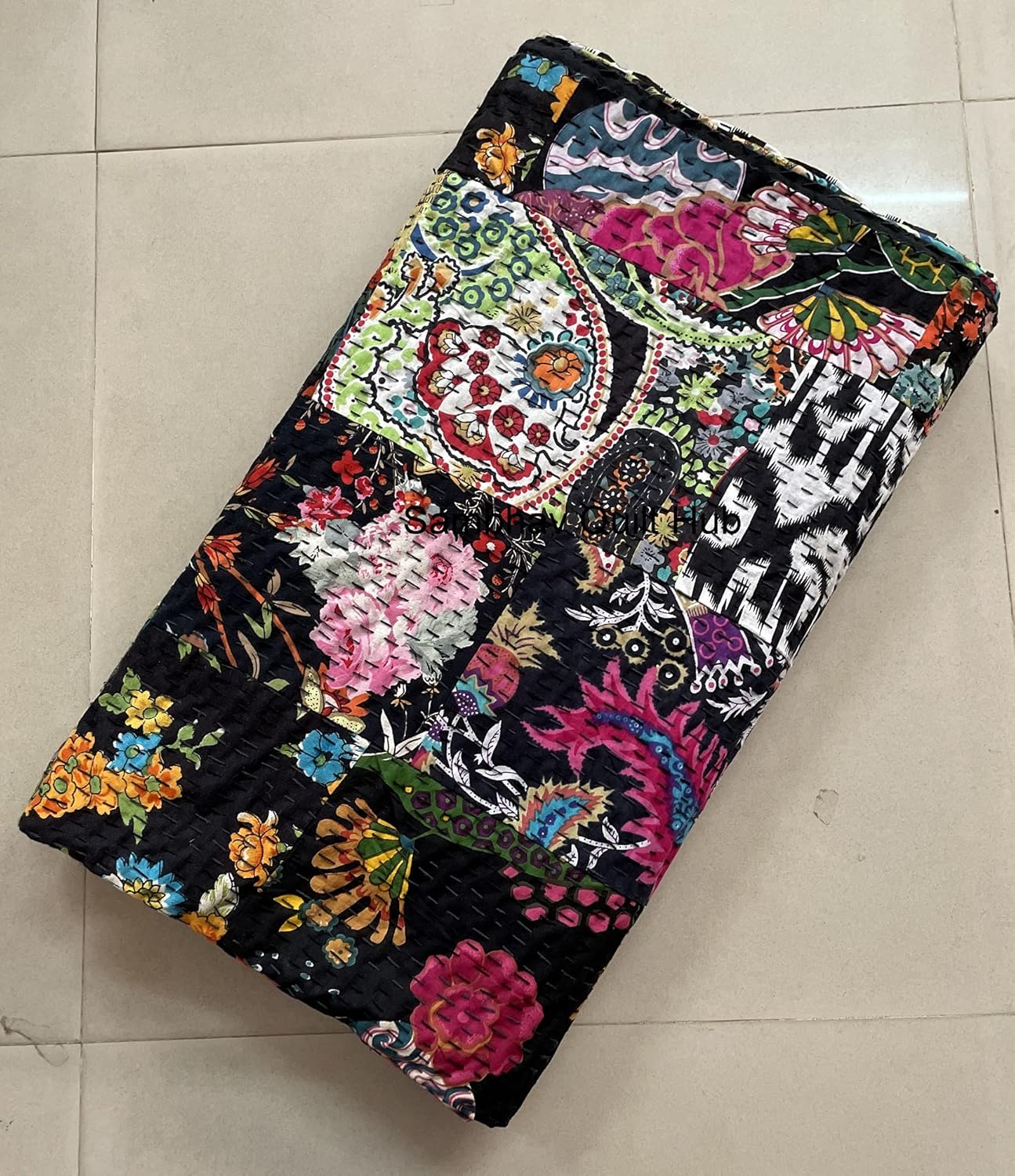 Cotton Indian Quilt Kantha Quilted Bedspreads,Throws,Ralli,Gudari Handmade Bedding newly made this is a special hand quilted Kantha. This work is done in countryside that provides work and livelihood for women in COUNTRYSIDE.The entire quilt is painstakingly embroidered with thousands of small and delicate kantha stitches to create a one of a kind masterpiece! It is made from vintage old cotton saris, and softly quilted . It is embroidered by artisans in countryside. Kantha is the ancient Indian art of embroidery, actually the kantha is a simple running stitch. The way in which the stitch has been used is what makes the quilt extraordinary. While making the PIECES, the cloth is given layers that are kept together by the stitches. It is made is such a way that it is REVERSIBLE, can be used from both sides. As this is made from vintage sarees, it has some imperfections. They have patches of other color clothes. they might have some stains, although we wash them well before shipping to remove bad odor and spots. All these imperfections make these vintage art pieces more unique, charming & perfect piece for your home. We hope u would love this art. Note – colour may be little bit change because of the monitor screen setting or may be some camera lights . Washing only in cold water or dry clean