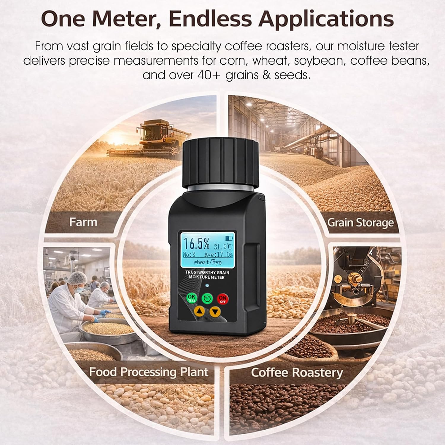 BTMETER Grain Moisture Meter– Compact, Accurate & VersatileThe BTMETER Pro Grain Moisture Meter is a versatile, high-precision tool engineered for today’s agricultural professionals—from farmers and grain traders to food processors and quality control technicians. Capable of accurately measuring moisture in 40+ grains including wheat, corn, coffee beans, cocoa beans, soybeans, and barley, this device delivers the insights needed for informed decision-making across planting, harvesting, storage, and processing stages.Product FeaturesPortable & Easy to Operate: Compact and lightweight design with one‑hand operation, providing real‑time moisture and temperature readings.Dual Temperature Unit Switch: Switch between Celsius and Fahrenheit degrees.40+ Grains Supported: Measures moisture in 40 types of grains, including coffee beans, cocoa beans, wheat, corn, and more.High‑Definition Dot‑Matrix LCD: Clear text display for easy reading and intuitive operation in various lighting conditions.Multi‑Language Interface: Menu supports multiple languages, allowing users worldwide to operate the meter comfortably.Technical ParameterSize: 6.49 × 2.79 × 2.91inEquipment weight 432 g Measurement resolution: 0.1% humidityHumidity measurement accuracyThe standardized grain: ± 0.5%Within the range of<10%: ± 1%Within the range of >10%: ± 1.5%if the humidity is too high, the error will increase