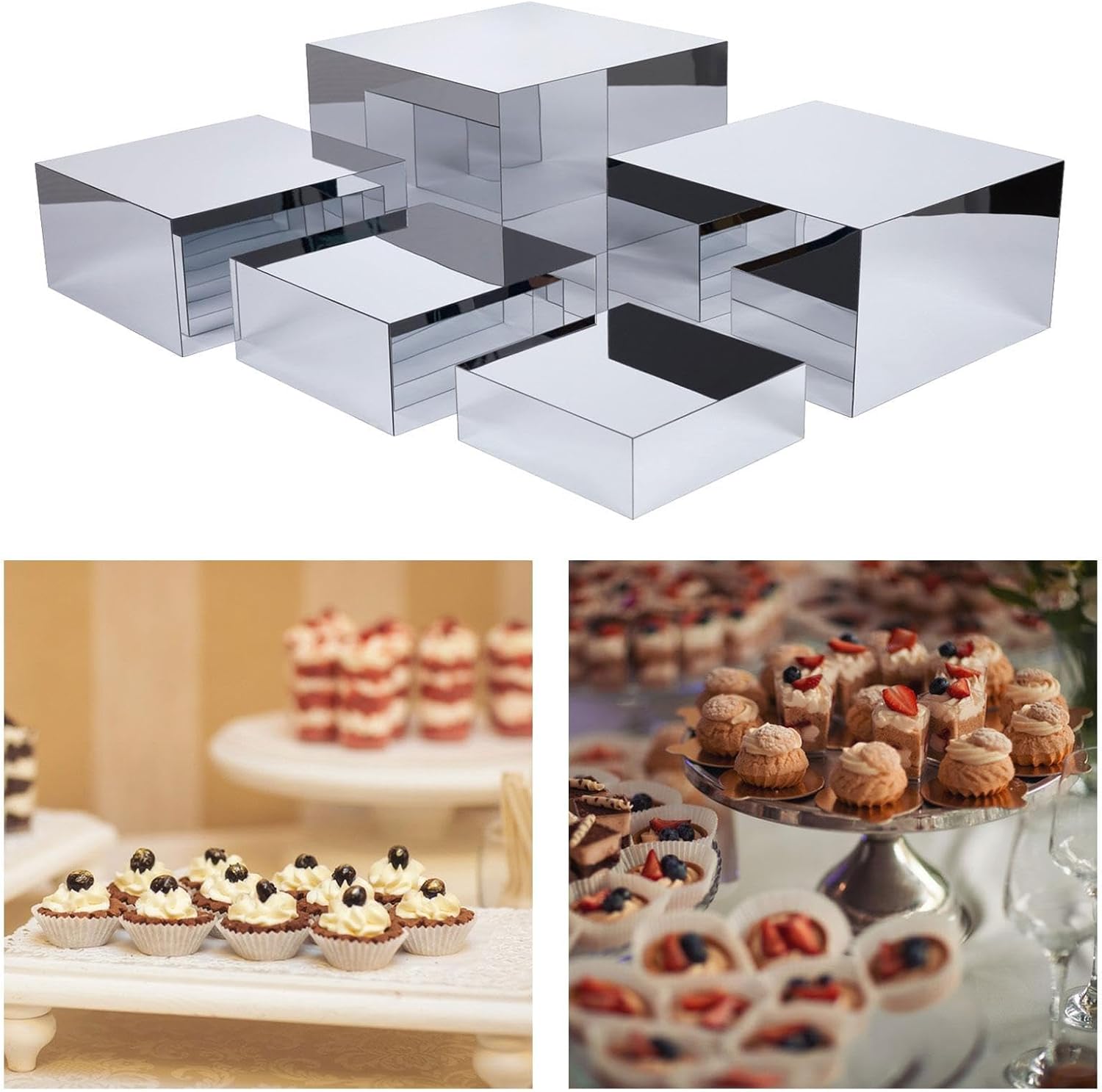Description: - 【Mirror Design】: The silver mirror design Buffet Riser provides good reflective effects, enhancing the visual appeal of your food It makes your food more enticing and elevates the quality and class of your buffet. - 【Acrylic material】: Buffet Riser is made of mirror acrylic material, which is strong, wear resistant, smooth, with delicate texture, and easy to clean - 【Dessert stand】: Food Service Display Riser is very suitable for displaying your cakes, cupcake at a wedding party , banquet, weddings, event, birthday party and is a must for any cake shop or bakery. - 【Wide Application】: Acrylic Display Riser can easily create a better viewing effect for displaying food, cosmetics, figurines models,collectibles, jewelry, plants, flower arrangements, art photography etc. - 【Simple design】: The cubic display stand adopts a simple design, which can be adapt with various scenes and .Specification: - Material: Mirror AcrylicSize Chart:3pcs Kit: Number 1 size 15cmx15cmx5cm/5.91inchx5.91inchx1.97inch; Number 2 size 17.5cmx17.5cmx7.5cm/6.89inchx6.89inchx2.95inch; Number 3 size 20cmx20cmx10cm/7.87inchx7.87inchx3.94inch5pcs Kit: Number 1 15cmx15cmx5cm/5.91inchx5.91inchx1.97inch; Number 2 17.5cmx17.5cmx7.5cm/6.89inchx6.89inchx2.95inch; Number 3 20cmx20cmx10cm/7.87inchx7.87inchx3.94inch; No. 4 22.5cmx22.cmx5cmx12.5cm/8.86inchx8.66inchx1.97inchx4.92inch; Number 5 25cmx.25cmx15cm/9.84inchx0.10inchx5.91inchPackage Includes:1 Set Buffet RiserNote:Please allow slightly errors 1-2cm differences due to manual measurement.