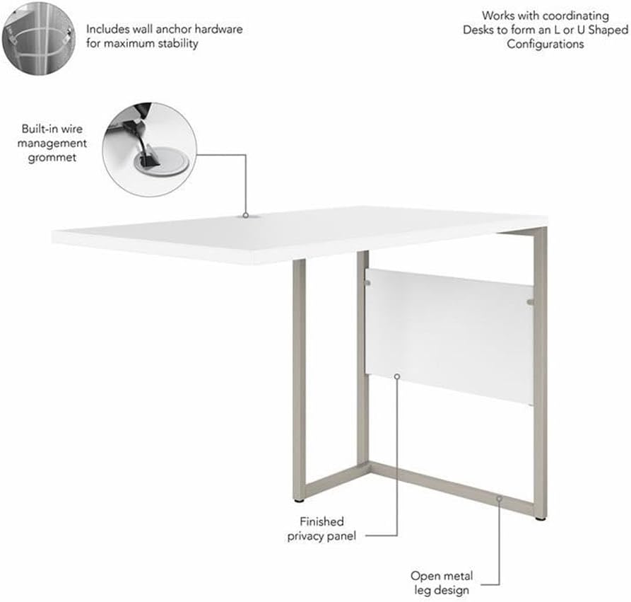 The Bush Business Furniture Hybrid 42W x 24D Desk Return/Bridge blends a durable work surface with sturdy metal legs to offer a stylish, long-lasting solution for the modern professional. The Return/Bridge works with coordinating Hybrid 48W, 60W and 72W Computer Desks (sold separately) to form a spacious U or L Shaped Desk. A built-in wire management grommet keeps cords and cables in order, so your work area remains free from unnecessary clutter. Find the perfect look for your space with five contemporary finish options: Black Walnut, Modern Hickory, Platinum Gray, Storm Gray and White. This modern desk attachment has been meticulously tested to meet or exceed ANSI/BIFMA quality standards for safety, durability and performance and is backed by the Bush Business Furniture 10 Year Manufacturer's Warranty. American made with U.S. and imported parts.