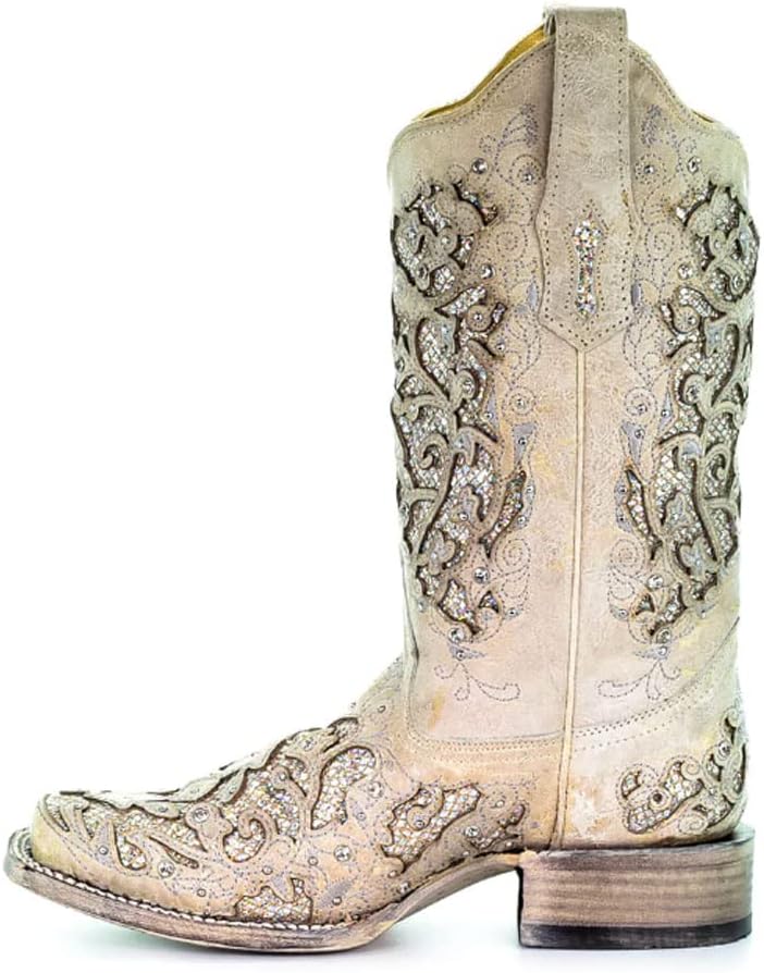 These Corral Boots are ideal for any occasion. Its beauty is not only in its 11.5-inch shaft full of embroidery and decorations but also in its crackled leather finish, and in its color options. This is a style you can wear all day without worrying about getting tired. It features sturdy pull-on straps with its square toe silhouette.The smooth inside leather lining, cushioned leather insole, leather outer sole with a rubber heel cap, and 1.5-inch stacked heel, scream comfort. TECH SPECS: - Handcrafted by more than 90 artisans who guarantee its prolonged useful life. - Ethical Factories. - Authentic cowgirl style. - Hand-lasted, Hand-cut, Hand-finished. Material: Cowhide Shaft height: 11.5 in Heel height: 1.5 in Construction: Goodyear welt Sole material: Cowhide outsole
