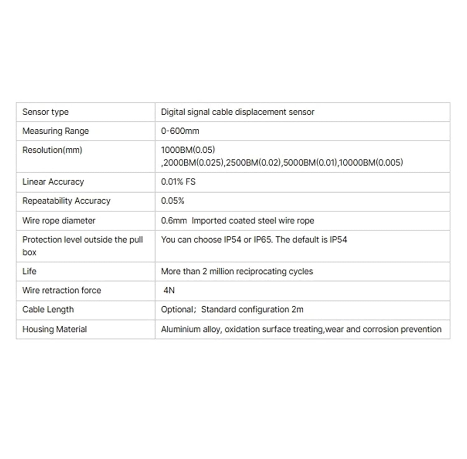 sensorDescription : 2-M4 deep 8 mounting holes Wire displacement sensorModel Number : HA40S-600mm-2000PType : Magnetic EncoderUse : Measuring distanceTheory : Convert analog signals into linear signalsOutput : Digital signalMeasuring Distance : 0-600mmOutput signal : Open collector / PNP/Push-pull / Voltage/ Line Driveroutput : 10PPR-10000PPRresolution ratio : 0.1 0.05 0.025 0.002.0.01.0.005Wire rope diameter : 0.6mm Speed Max : 1000mm/sLinear Accuracy : 0.01%FSRepeatability Accuracy : 0.05%temperature : -30 ~ 90