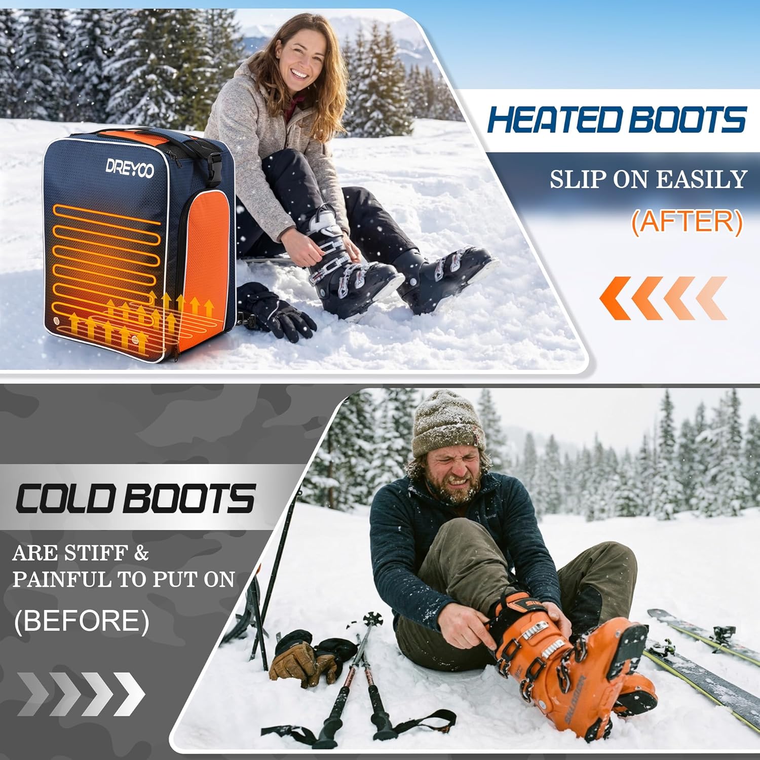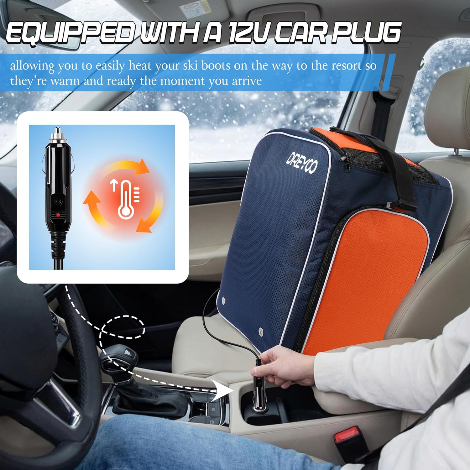 Features: Built in heating system warms ski boots up to 50°C (122°F) in about 20 minutes, reducing stiffness and improving comfort. Supports both AC 100–120V wall power and DC 12V car power, making it easy to heat your boots at home or on the way to the ski resort. 55L capacity with waterproof boot compartments, a large front pocket for a helmet, and multiple accessory pockets for goggles, gloves, and clothing. Made of durable 600D waterproof Oxford fabric with a reinforced waterproof bottom to prevent moisture when placed on snow or wet ground. Ergonomic padded shoulder straps and back panel ensure comfortable carrying, with reinforced handles for versatile transport. Specifications: Material: Waterproof 600D Oxford fabric Color: Black Size: 15.7 × 12 × 17.7 inches (55L capacity) Heating Temperature: Up to 50°C (122°F) Heating Time: Approx. 20 minutes to reach maximum temperature Power Input: AC 100–120V / DC 12V Package Includes: 1 × Heated Ski Boot Backpack (55L) 1 × AC Wall Plug 1 × DC 12V Car Plug 1 × User Manual Notes: Manual measurement may result in slight size differences. Colors may vary slightly due to different display settings