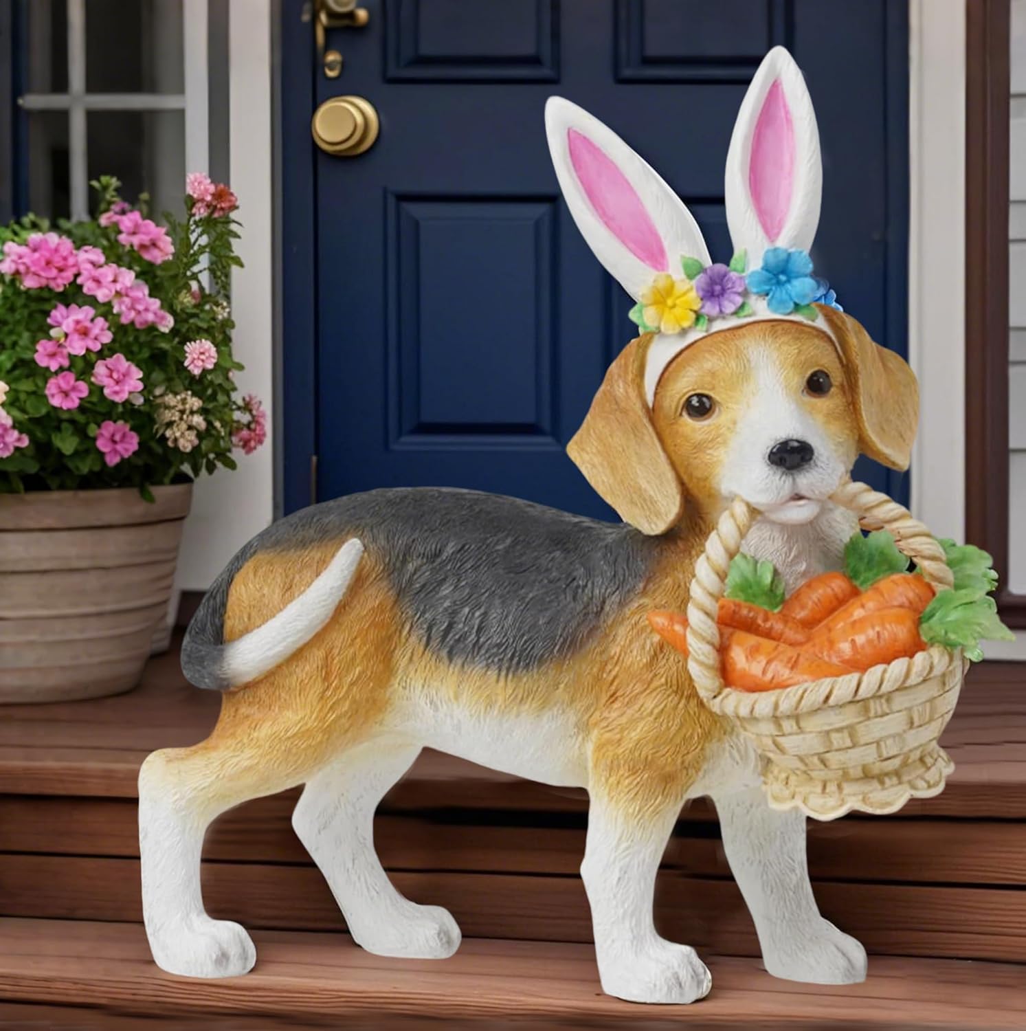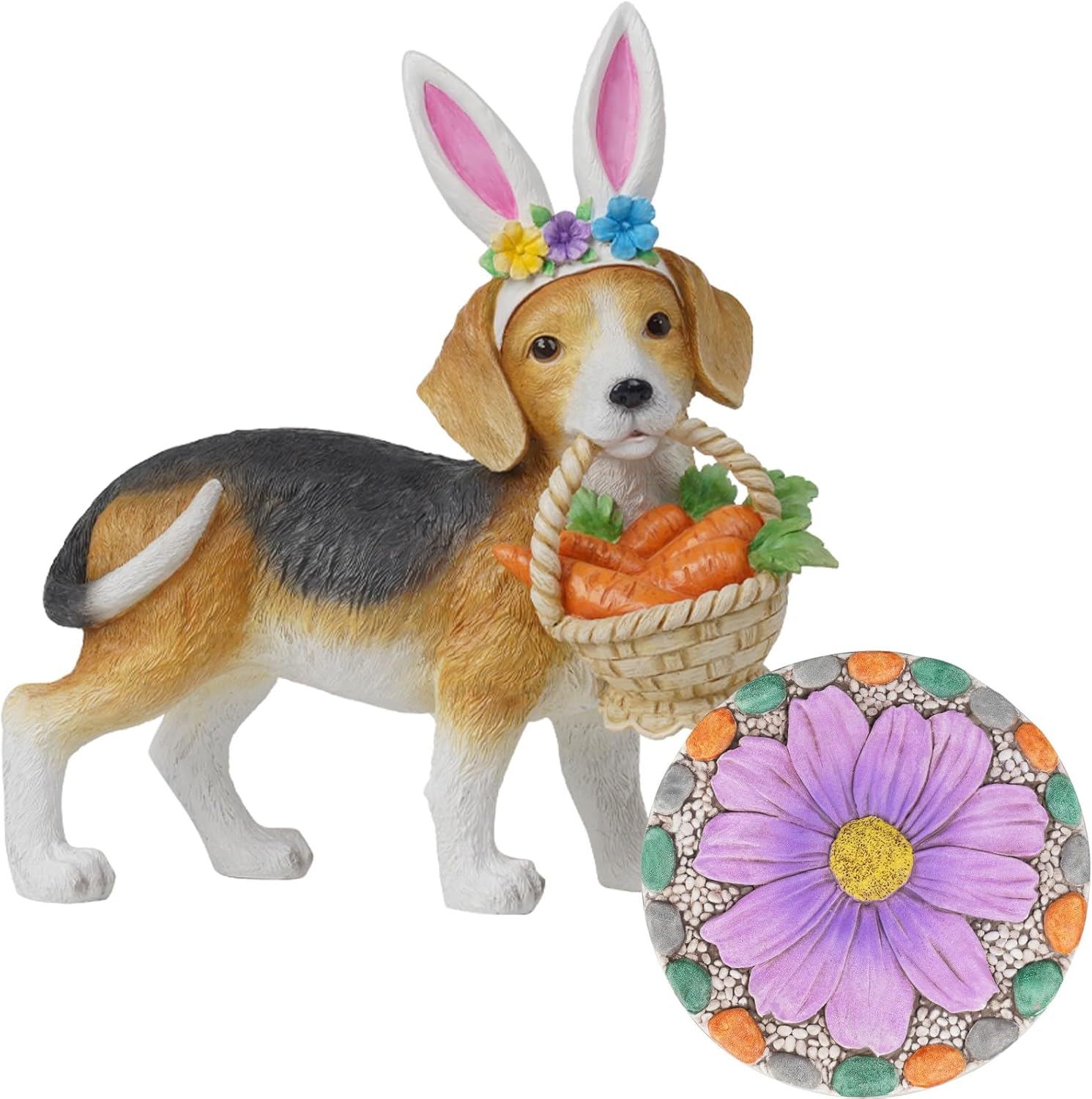Add whimsical charm to your garden this spring with this delightful Easter Beagle statue and stepping stone set. The adorable beagle figurine features realistic detailing with tri-colored fur in brown, black, and white, wearing festive bunny ears adorned with colorful spring flowers. The playful pup carries a woven basket filled with vibrant orange carrots, making it a perfect seasonal accent. Complementing the statue is a decorative stepping stone showcasing a large purple daisy design surrounded by orange and green accents on a textured background. This charming outdoor decor combination brings the joy of springtime to your garden, patio, or entryway. The durable construction ensures lasting beauty through the seasons. Whether displayed together or separately, these pieces create enchanting focal points in your outdoor space and celebrate the spirit of spring.