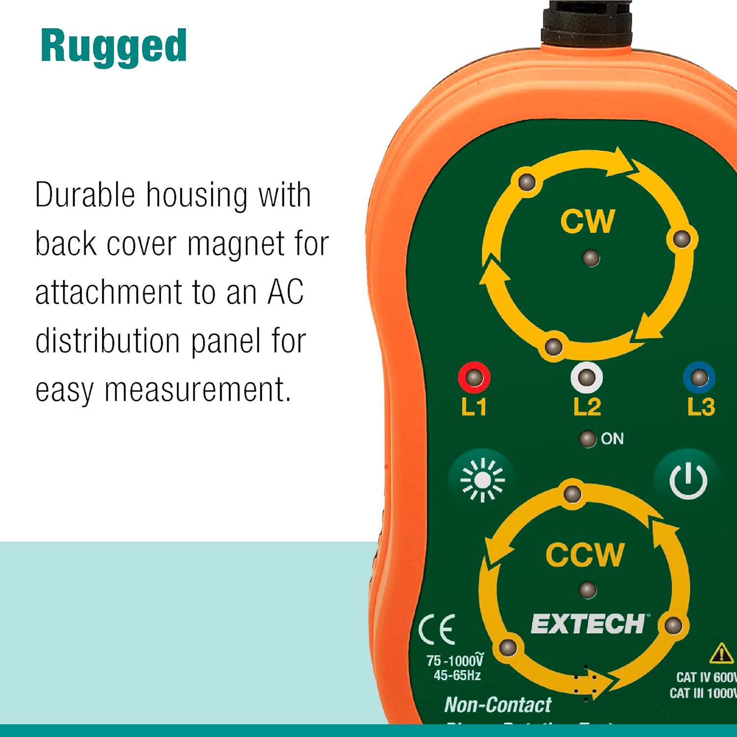 Tests up to 1000VAC with visual/audible indication. 75 to 1000VAC input voltage with 45 to 65Hz frequency range. LEDs indicate phase orientation (clockwise or counter-clockwise) and whether each phase is live. Beeper sounds intermittently when correct phase is detected and continuously if phase is reversed. Durable housing with back cover magnet for attachment to an AC distribution panel for easy measurement. Adjustable Hi/Lo LED brightness switch for making measurements in dimly lit areas or sunlight. Fully insulated alligator clips with wide jaws. Low battery warning. Complete with three built-in 30" test leads with large color-coded alligator clips, four AA batteries, and pouch case