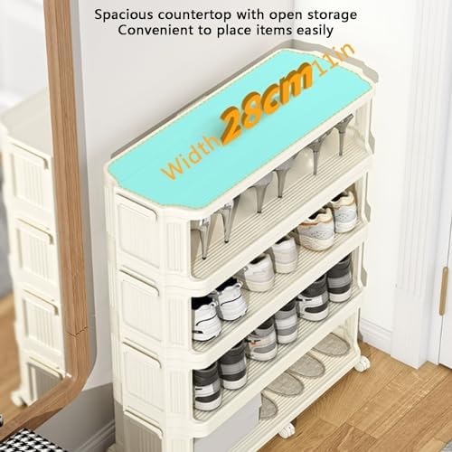 Introducing our Foldable Shoe Cabinet on Wheels – the perfect blend of style and functionality for your shoe storage needs. This modern narrow plastic shoe rack is designed to fit seamlessly into hallways, bedrooms, or college dorms, making it an excellent choice for any living space. Available in a chic cream white, our shoe cabinet comes in three versatile sizes: 73.5 x 29 x 79.5 cm, 73.5 x 29 x 97.5 cm, and 73.5 x 29 x 115.5 cm, catering to different storage needs. Constructed from robust plastic, this extendable and stackable shoe rack features smooth-rolling bearings, allowing you to move it effortlessly wherever you need it. Assembly is straightforward, and the dustproof design ensures your footwear remains clean and well-protected. With its multi-layered structure, this high shoe cabinet provides ample space for various shoe styles, promoting easy visibility and access without the frustration of digging through clutter. The vertical orientation maximizes storage efficiency in compact areas, creating a neat and welcoming entrance to your home. Whether you're organizing sneakers, heels, or boots, this shoe cabinet adapts to your lifestyle and enhances your living space. Please be aware that manual measurements may vary by 1-3 cm, and color differences may arise due to lighting and monitor settings. Upgrade your shoe storage solutions today with our stylish and practical Foldable Shoe Cabinet on Wheels!