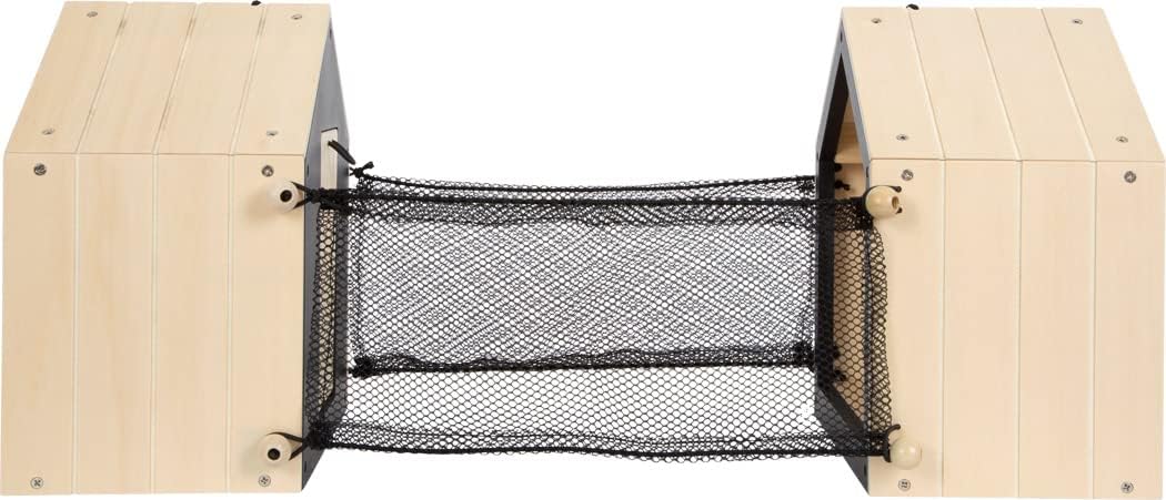 A rabbit hutch for the plush long-eared rabbit! The double cabin made of sturdy wood, which can also be used as a transport cage, consists of two houses that can be tied together with balls and loops: In one part, the stuffed rabbit can sleep and is not disturbed by a magnetic closing valve; on the other hand, the rabbit can look out through a mesh fabric. Two mesh fences can be tied between the parts of the loft to create an outdoor enclosure. Incl. Plush rabbit, brush, bowl, wood and felt root as well as lettuce leaf and rabbit scraps made of felt.