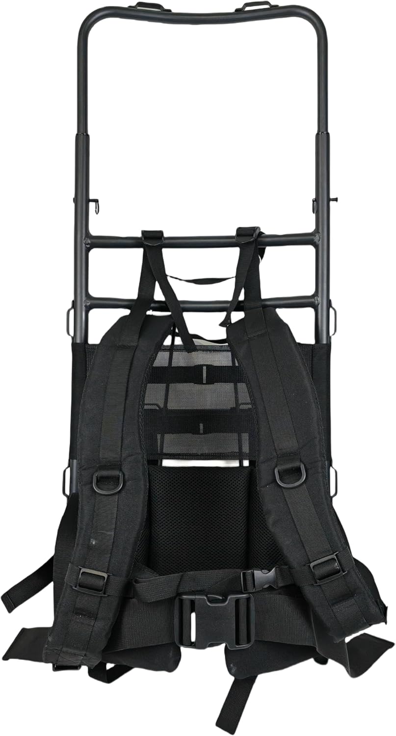 Experience superior load-bearing capability with this rugged external frame backpack, perfect for serious hunting expeditions. The robust metal frame provides excellent structural support while allowing proper airflow between your back and the pack. Features include multiple adjustable straps for a customized fit, durable black fabric construction, and a versatile cargo area that accommodates various gear configurations. The included bright orange rain cover ensures your equipment stays protected in wet conditions while adding visibility in the field. The modular design allows for attachment of additional gear and accessories using the integrated webbing system. Strategic compression straps help stabilize loads and maintain a balanced center of gravity while navigating challenging terrain. Whether you're planning a day hunt or an extended backcountry expedition, this external frame pack delivers the durability and functionality needed for serious outdoor pursuits.