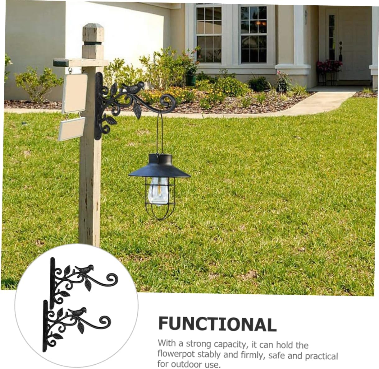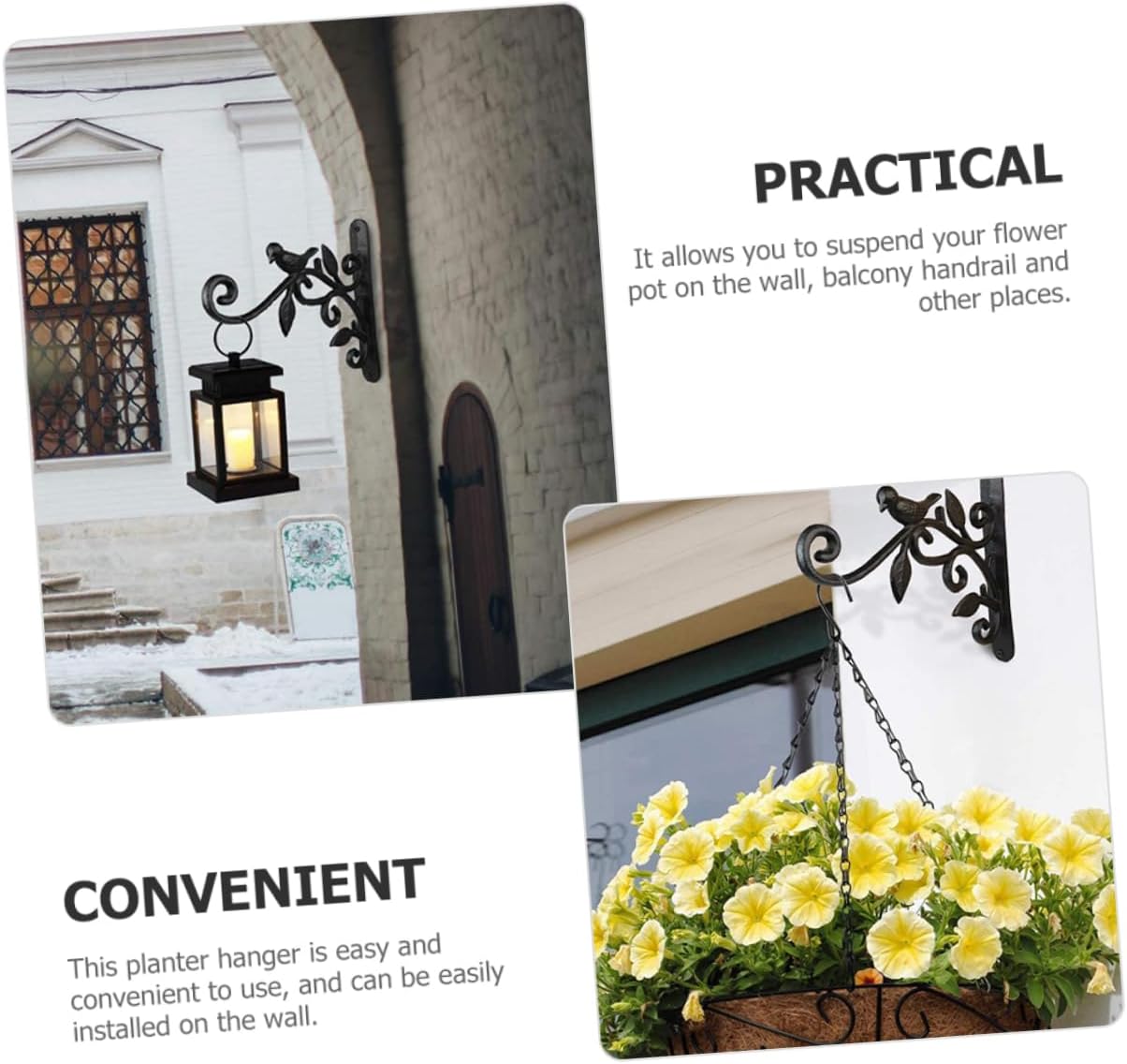 Package List 2 x Plant Bracket Hooks 4 x Screws 4 x Bolts Characteristics -Size:25.00X22.00X2.00cm/9.82X8.65X0.79in wall plant hanger -Color:Black wall hanging planter bracket -Material:Iron lantern hook for wall - Can be easily hung at indoor, outdoor or in the garden, it can hold the flower pot stably and firmly iron wall hook. - The rustic wall hook will add some classic minimalist flair to compliment your home decorations flowerpot hanging bracket hook. - The material is safe and light, which is wear resistance and practical for the lasting time use wall mount planter hook. - This planter hanger is suitable for hanging planters, flower basket, lanterns, string light, bonsai, wind chimes, etc Bird Feeder Wall Hooks. - Hanging your planter for saving space, and it can provide you a large gardening space plant hanging bracket.Goods Descriptionhanging planter hook This iron wall hanging hook is for hanging a variety of flowers, plants, wind chimes, lanterns, bird troughs and other decorations, creating a beautifying space and charming atmosphere.decorative planter hanger It will add elegance and beauty to your home or garden