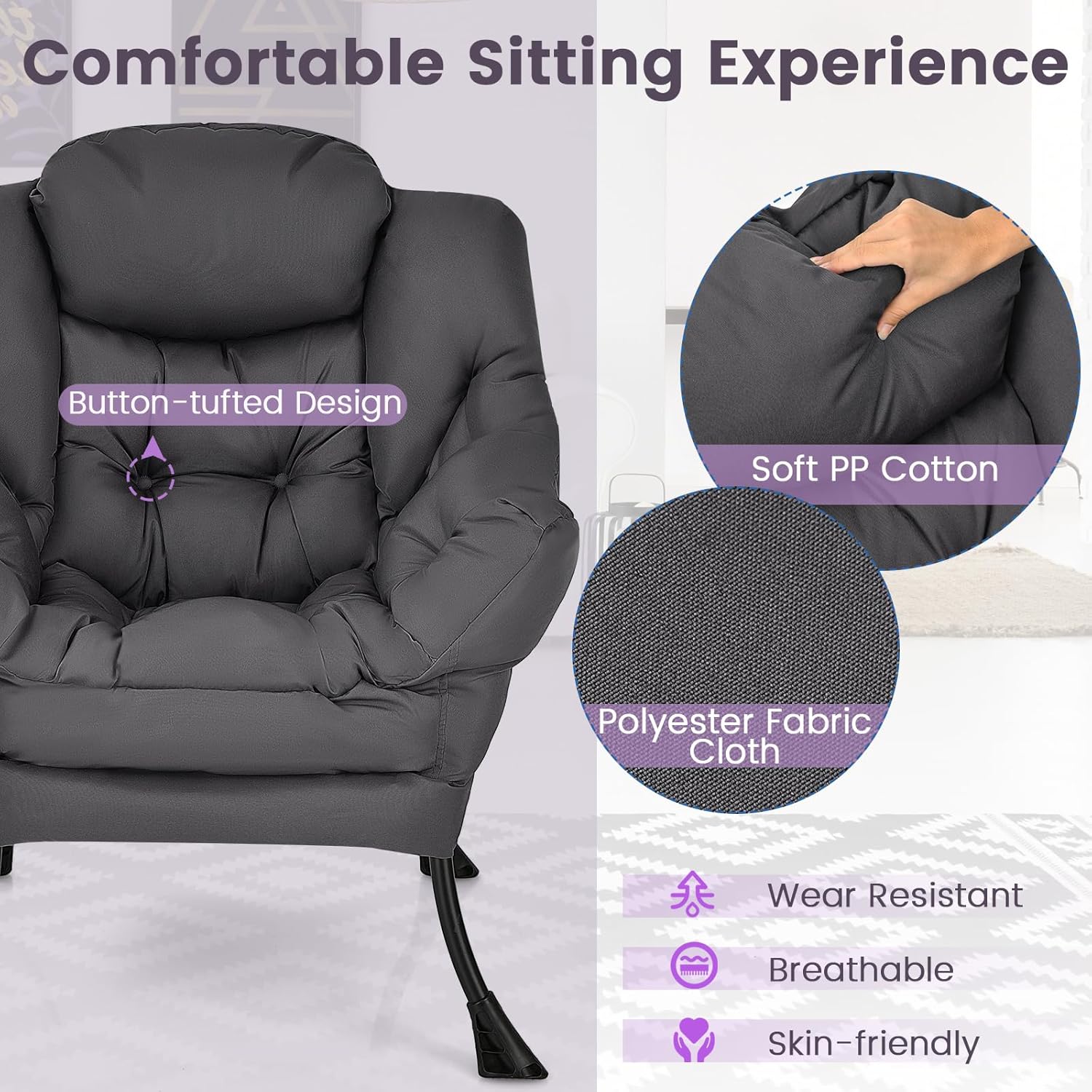 This stylish-looking single sofa is particularly suitable for placing in the living room, bedroom, balcony and other places. This lazy chair is made of high-density PP cotton and polyester fabric, and the cushions are soft and comfortable. There is also a pocket on the side of the armrest, which is convenient for you to place your cell phone and remote control. Our single sofa is made of a steel frame as a structure that can withstand 330 pounds of weight and will not rock or collapse easily. The bottom has plastic foot pads to protect the floor from scratches. In addition, this accent chair can perfectly fit the curve of your body and can provide enough support for your neck, back, waist and hips. Best of all, this sofa chair is easy to assemble, and the cover can be removed for machine washing. This is an ideal accent chair for you.