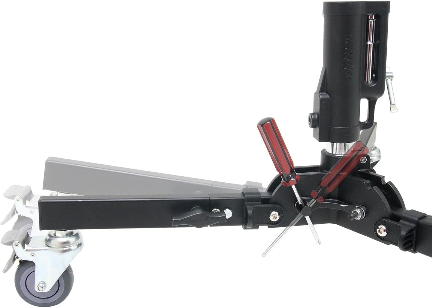The Kupo Quick Action Roller Base Stand with wheels is specifically designed for lighting fixtures that need to be placed in low positions. Features a quick-release locking system equipped on each leg for folding and unfolding the stand within seconds. It also comes with a universal stand top that allows it to fit into any fixture. Comes with a junior pin or baby receiver. Meanwhile, your own rolling stand is available by simply adding a century stand column into the junior receiver (28mm socket). One leg is supplied with a leveling device for adjusting the stand on uneven ground. One extendable leg (additional 4.7” (12cm)) is designed for allowing an increase to the loading capability while connecting a boom arm.