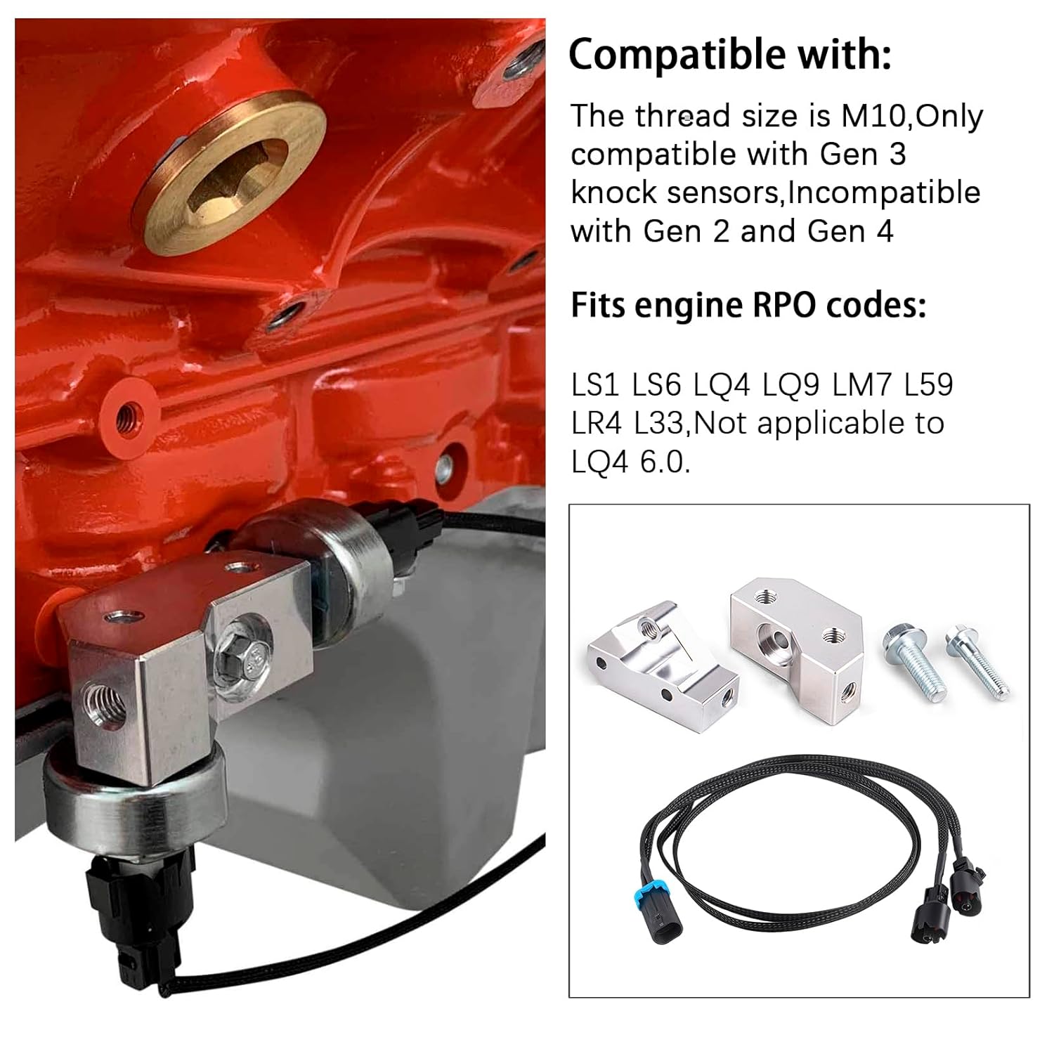 Function:Allows LS Gen 3 knock sensors to be retained and relocated from the valley pan area to the bottom edge of the engine block.If you Tired of pulling the entire intake just to change them,your like this grab it. You won't be disappointed.Material:Premium quality aluminum, high heat tolerance, corrosion resistantCompatible with: The thread size is M10,Only compatible with Gen 3 knock sensors,Incompatible with Gen 2 and Gen 4Fits engine RPO codes:LS1 LS6 LQ4 LQ9 LM7 L59 LR4 L33,Not applicable to LQ4 6.0.Note:NO installation guide included! If you have a 4x4 you’re better off just pulling the intake off and replacing them in the factory location.Because it is installed in a very tight position, you have to remove the things around it that block you first,so it is recommended that professionals install it or you have your own workshop to operate it.Includes:2*aluminum knock sensor brackets1*36" Knock Sensor Extension Relocation Harness