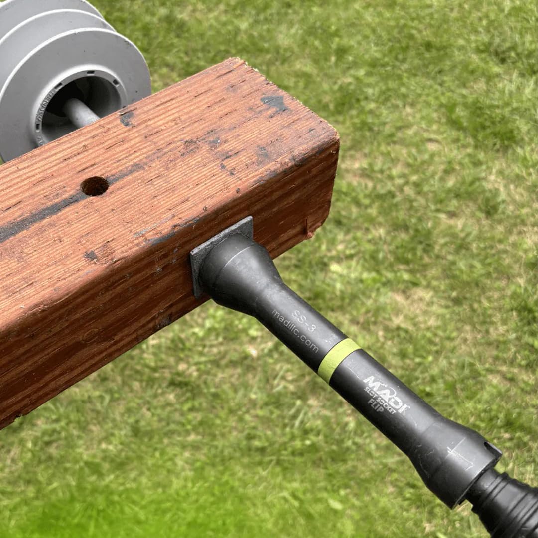 The Madi Slot Socket Flip is impact rated, and features three square opening in one socket. The ¾” (oversize) fits ½” hardware, 1” fits 5/8” hardware, and 1-1/8” fits ¾” hardware. The Madi Slot Socket flip 3 comes with a Secure Lock quick connect adapter that eliminates unwanted disconnect and is easy to use with rubber gloves. Also works for Multi-Use Wing Nut and Eye Bolt Type Clamp Applications such as: Grounding Clamps, Hot Line Clamps, T-Clamps, Underground Feed Through Bushings, Layout Arm Hardware, Stringing Block, Temporary Arm Insulators, 5/8” and ¾” Eye Nuts, Large Hardheads or Lags, Large J Hooks, and Non-standard Eye Nuts on the Composite Arms.
