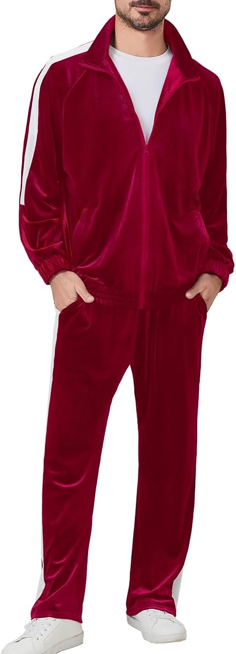 Men's casual jogging suit includes a velvet track jacket with full zipper offers easy on-and-off,and matching track pants with adjustable drawstrings.With 2 side pockets to store your personal items safely while exercising.