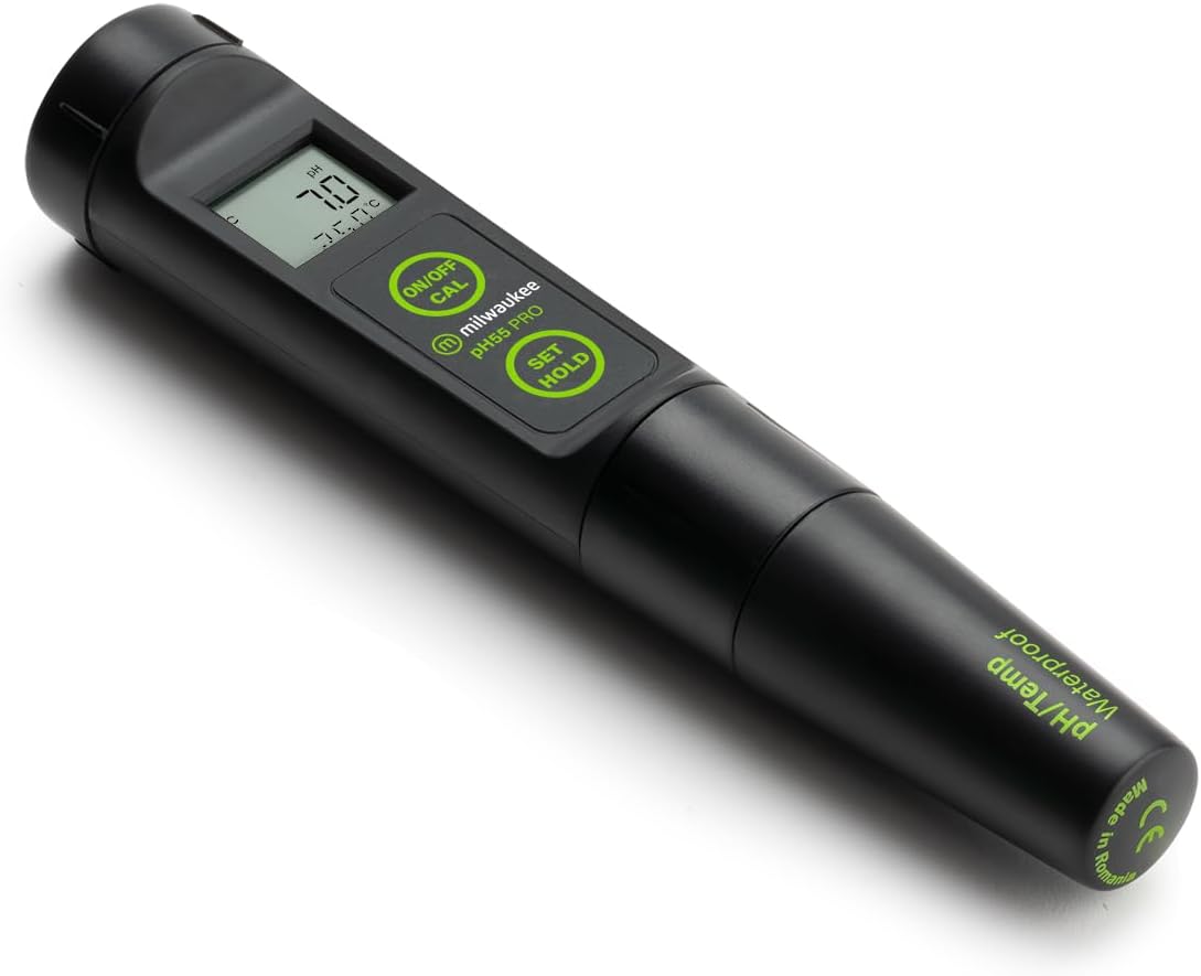 Fast easy to read results with large digital LCD readout. Extreme pH accuracy to ±0.1 pH with an extended pH range (-2.0 pH to 16.0 pH). Resolution to 0.1 pH. Lightweight and portable. Easy measurement: just place the probe in the sample, gently stir, wait for the stability indication to show a stable reading and then freeze the reading. Is fully compensated for temperature (ATC). Simple Automatic one or two-point calibration. 2 Sets of pre-memorized buffers. Gel-filled, double junction pH electrode for low maintenance and high performance. Over 300 hours of battery life (batteries included). Fully waterproof to IP65. Replaceable pH electrode Mi56P. The Milwaukee Waterproof pH55 PRO pH/Temp. Tester is one of our most accurate cost effective, well rounded, rugged and reliable testers in the market featuring dual level LCD readouts, easily replaceable probe and extended pH ranges to meet almost any application. It's simple 1 or 2 point automatic calibration is simple-to-use and offers TWO sets of memorized buffers to select. Ideal for use in aquariums, hydroponics, horticulture, education, pools, beer and many other applications. The Milwaukee Waterproof pH55 pH/temp. tester offers: Accuracy The Waterproof pH55 PRO tester is accurate to +/-0.1 pH and +/-0.5 DegC (+/-1 DegF) and is easy to read. With easy 2 point automatic calibration, this pH tester is quickly calibrated to an accuracy of much more expensive meters. Simple design and rugged, it brings great value for any application. Why guess at your readings using litmus paper when you can have guaranteed accurate, digital LCD results. Long life The tester comes with a replaceable pH probe with a double junction probe designed for longer life. Fast response The probe is double junction allowing quick, accurate pH readings and respose times. Waterproof construction No more worries about dropping your tester while measuring. The pH55 PRO is waterproof to IP65. Light weight At just 3.5 ounces, the pH55 PRO is easy to