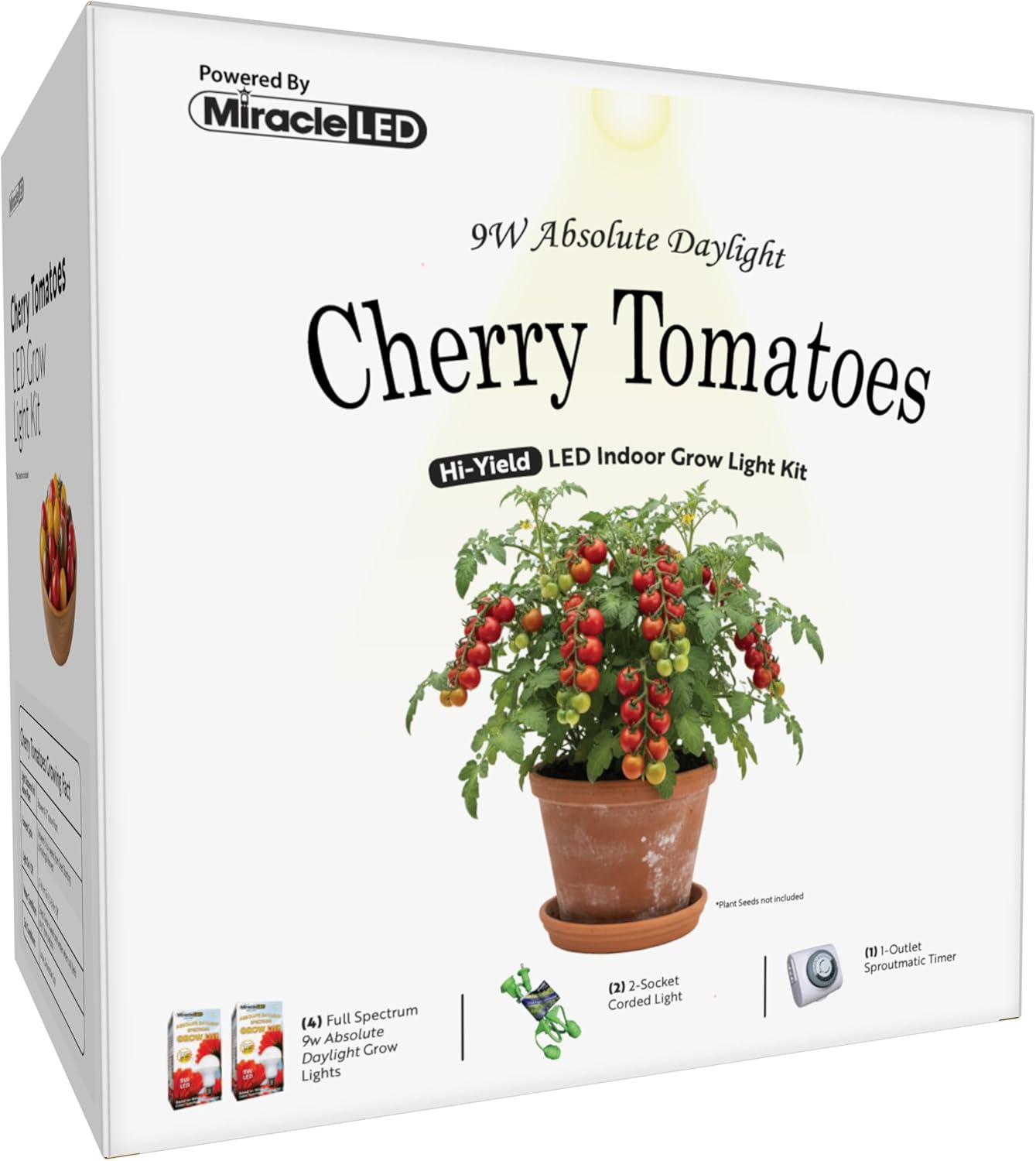 Want Fresh and Plump Cherry Tomatoes all year round? Use Miracle LED’s Cherry Tomato Starter Grow Light Kit! Start growing indoors with this powerful Absolute Daylight 9W kit which uses the power of full spectrum to provide the nutrients your plants need to grow nice and full. Our 9W Absolute Daylight Bulbs are designed to replicate the light spectrums found in Professional Grow Farm equipment right in your home! Plus, enjoy the strong and water resistant 2-socket that makes it easy to setup anywhere in your home, apartment, or dorm room elevating your home aesthetic. You’ll never have to sacrifice the layout of your home; just plug in and hook on where ever it is needed. The Sproutmatic timer is great for controlling the amount of light your plant is receiving. Images shown are for packaging and display purposes only. They are representative of the species or genus of plants that may be grown with artificial LED light. Results vary by many factors and artificial lights do not fully replace light from the sun.