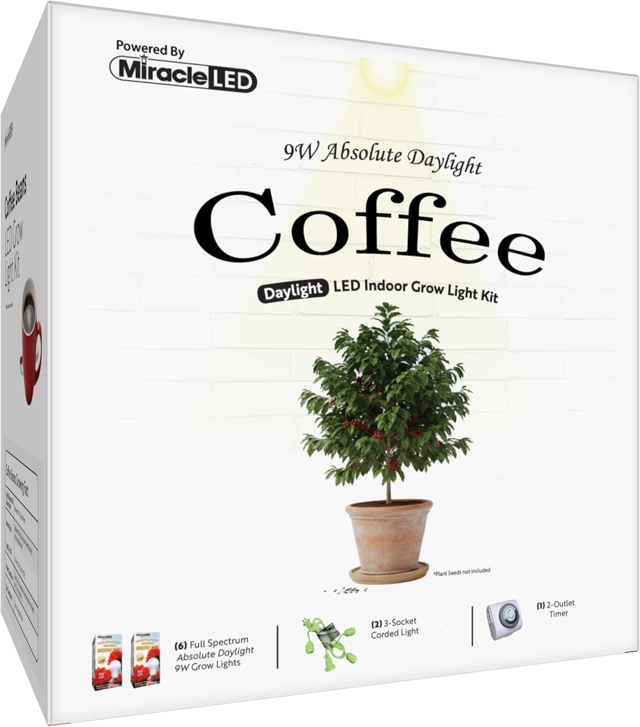 Want to grow Coffee right at home? Use Miracle LED’s Coffee Starter Grow Light Kit to help start your Coffee grow journey! Coffee plants need at least 10-12 hours of bright indirect light per day to thrive! Our grow light kit helps you be in control of the distance and amount of light your plants receive to stay healthy! Our 9W Absolute Daylight bulbs which uses the power of full spectrum to provide the nutrients your plants need to grow nice and full, helps you be in control of the distance and amount of light your plant receives. The 9W Absolute Daylight Bulbs are designed to replicate the light spectrums found in Professional Grow Farm equipment right in your home! Plus, enjoy the strong and water resistant 3-socket that makes it easy to setup anywhere in your home, apartment, or dorm room elevating your home aesthetic. You’ll never have to sacrifice the layout of your home; just plug in and hook on where ever it is needed. The timer included in your kit is great for controlling the amount of light your plant is receiving, automatically turning off the lights once the cycle is over and starts the cycle again at the set time. Images shown are for packaging and display purposes only. They are representative of the species or genus of plants that may be grown with artificial LED light. Results vary by many factors and artificial lights do not fully replace light from the sun.