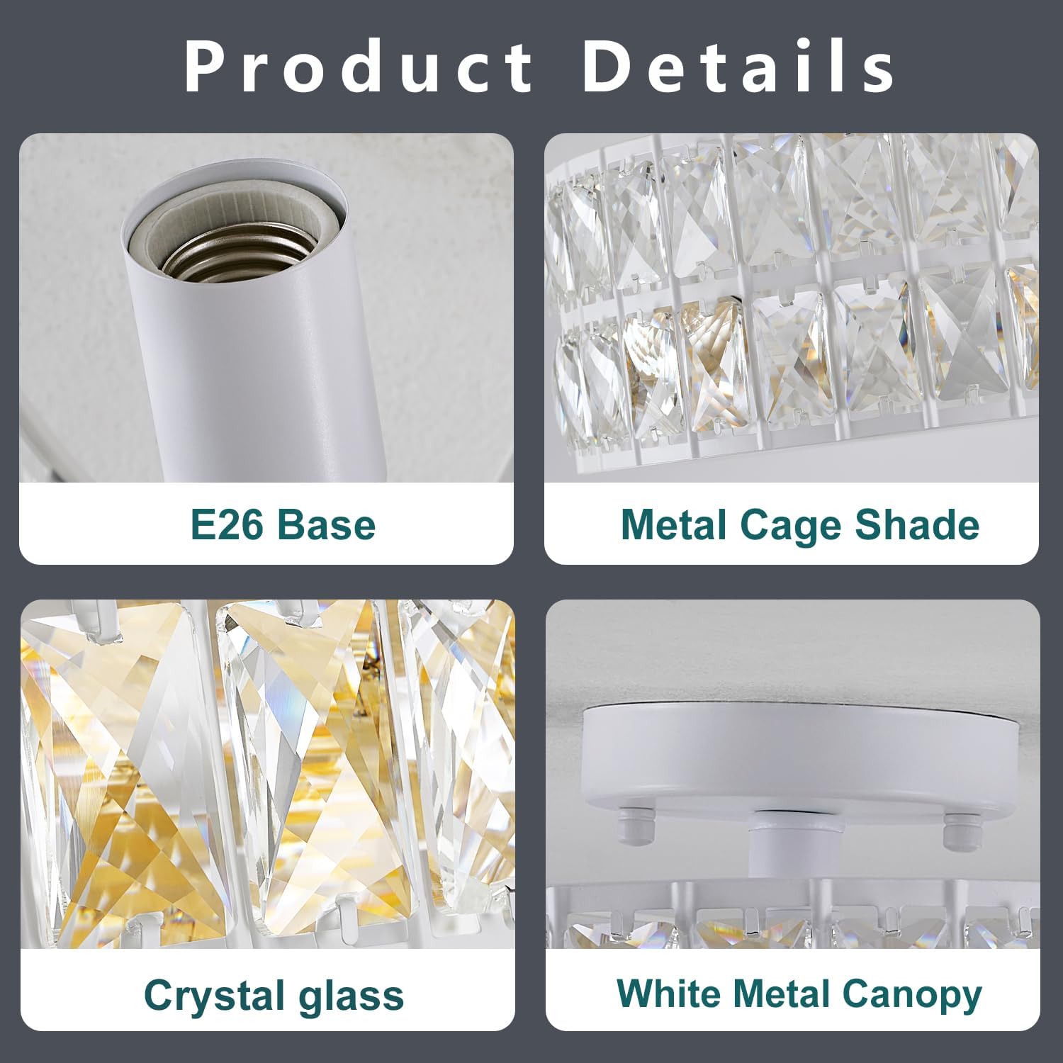 Illuminate Your Space with Elegance: The Exquisite Crystal Semi Flush Mount Ceiling LightElevate your home decor with our exquisite crystal semi flush mount ceiling light, designed to blend modern elegance with luxurious charm. Featuring a sleek white metal frame and dazzling crystal shade, this stunning fixture not only enhances your living space but also brilliantly reflects light, creating a warm and inviting atmosphere. Crafted from high-quality metal, it offers durability and maximum illumination while the premium clear crystals serve as a sophisticated accent piece.Measuring 11.8 inches, this versatile fixture is suitable for both flat and sloped ceilings, making it ideal for various settings such as your living room, dining area, hallway, or bedroom. With three E26 sockets (max 60W each), it is compatible with a range of bulbs, including incandescent, LED, CFL, and halogen. Customize your lighting experience with dimmable bulbs and a dimmer switch (not included), allowing you to create the perfect ambiance for any occasion.Installation is a breeze, as the ceiling light comes fully assembled with all necessary mounting hardware. We are committed to your satisfaction, so if you have any questions or concerns, our dedicated support team is available to assist you within 24 hours. Transform your space with this beautiful lighting solution and enjoy the perfect blend of style and functionality!