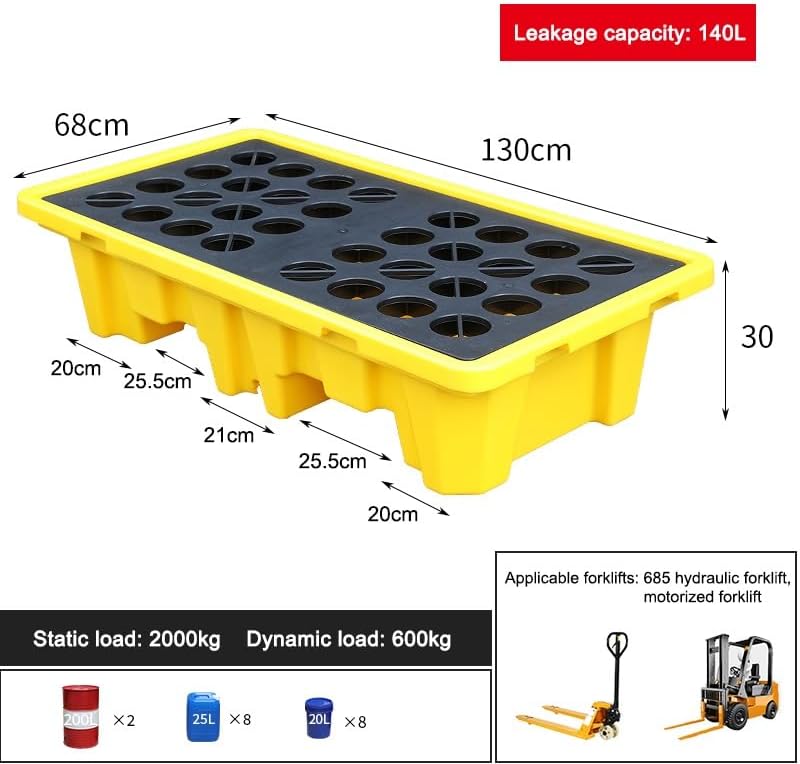 PRODUCT FEATURES:The top grates of this spill platform are removable for easy cleaning, while forklift pockets make relocation easy - This spill containment platform provides ample space and overflow capacity, reducing the spills and keeping the ground clean. Product name: Containment Spill Pallet/Low Profile Spill Containment Pallet Material: Polyethylene (HDPE) Feature: Thickened design, strong load-bearing, wear-resistant and fall-resistant Applicable scene: Warehouse, workshop, maintenance, supermarket, industrial, commercial, factory Easy to clean: Rinse with clean water PACKAGE CONTENT: 1/2 PCS x Leak-Proof Tray Note: Please choose the size before buying.