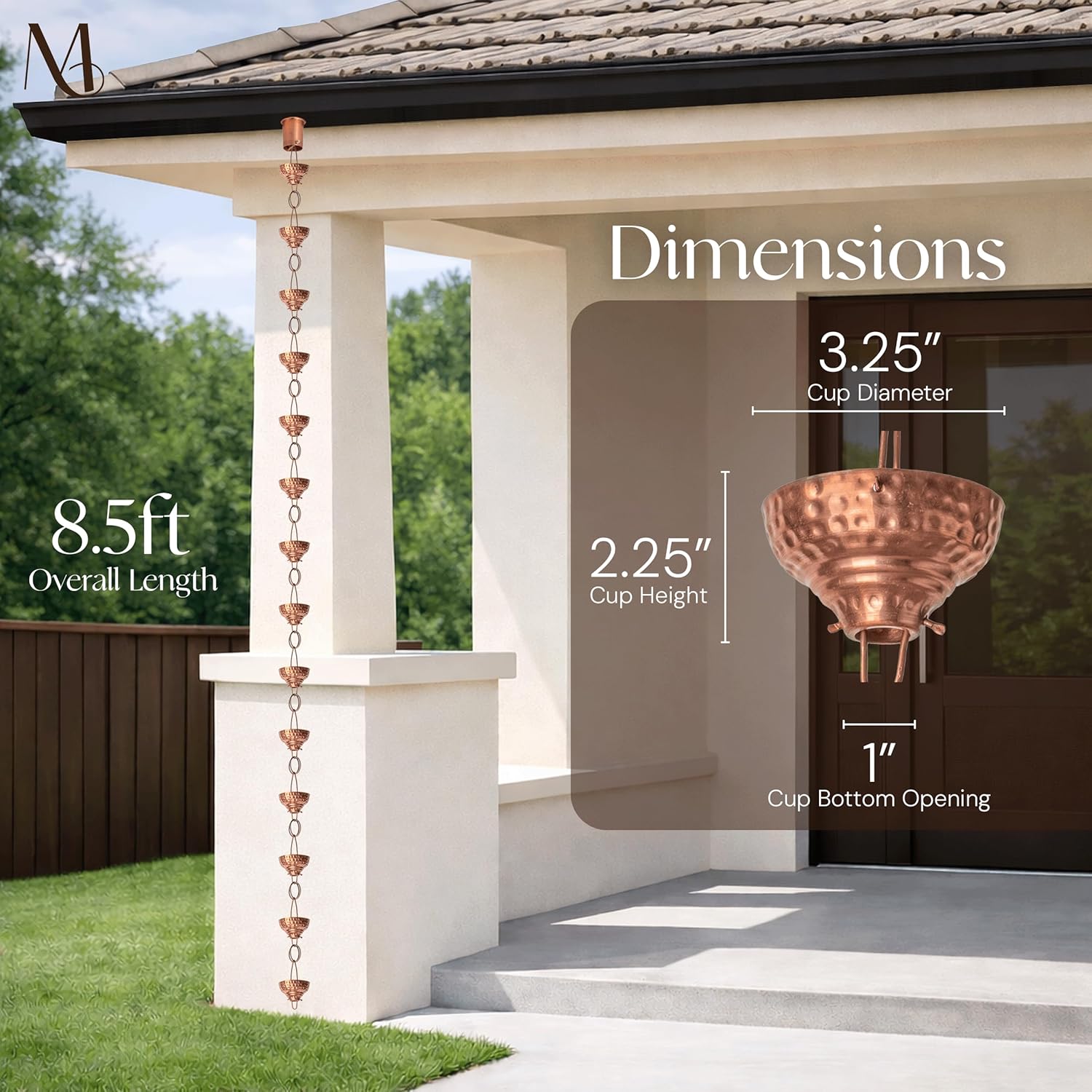 Monarch's Pure Copper Eastern Hammered Cup Rain Chain is a spectacular large cup rain chain. Each cup is individually hand hammered by skilled artisans with 13 cups linked together with 12 loop links to form a beautiful 8.5 ft. rain chain. The rain chain transports rainwater efficiently down its entire length to the ground where it can be stored in a receptacle for reuse. Assembled & ready to install using the fixed triangular gutter hanger.