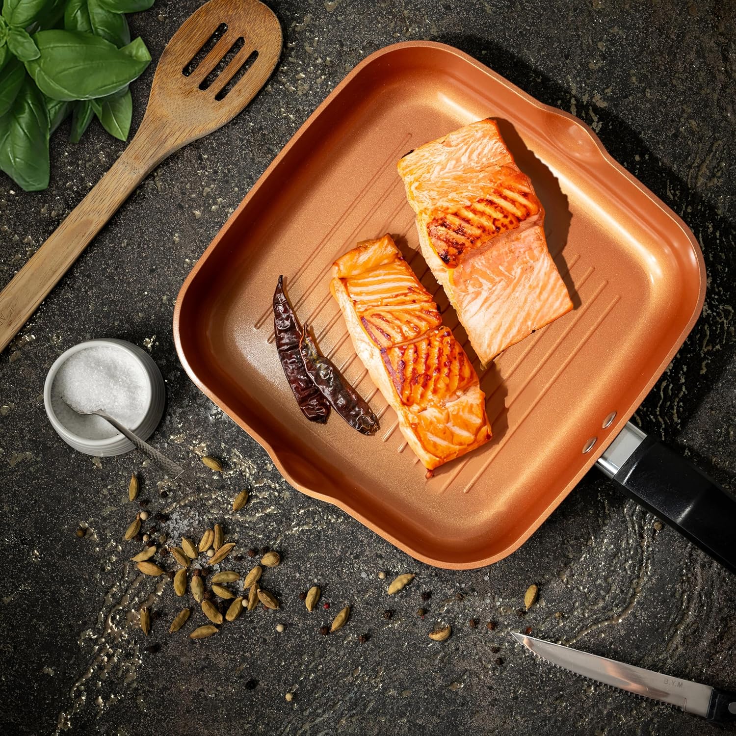 Moss & Stone 5 Pcs Copper Chef Cookware Set, 9.5” Non Stick Deep Frying Pan, Fry Basket, Steamer Rack, Dishwasher & Oven Safe, 5 Quart Deep Square Pan, Induction Copper Cookware Set Bundle With Square Grill Pan For Indoor Cooking, 9.5In Frying Pan Copper Non-Stick Saute Fry Pan, Induction Copper Pan for Meats & Vegetables, Aluminum Griddle Nonstick Stove Top Grill Pan