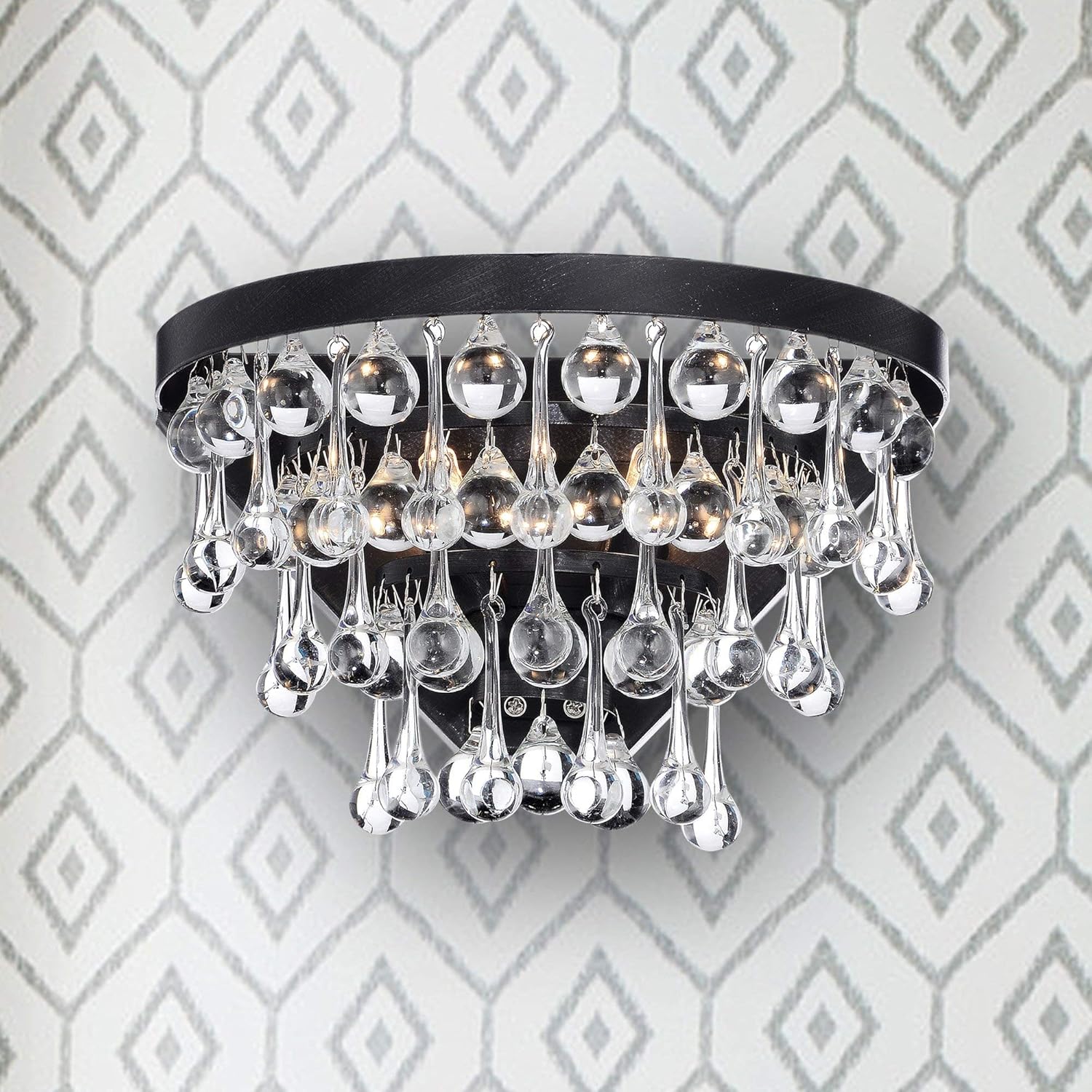 The Natalia 2-light wall sconce features a gorgeous antique black finished iron base with beautiful hanging crystals. This elegant sconce is sure to add a touch of class to any wall in your home. [assembly required]