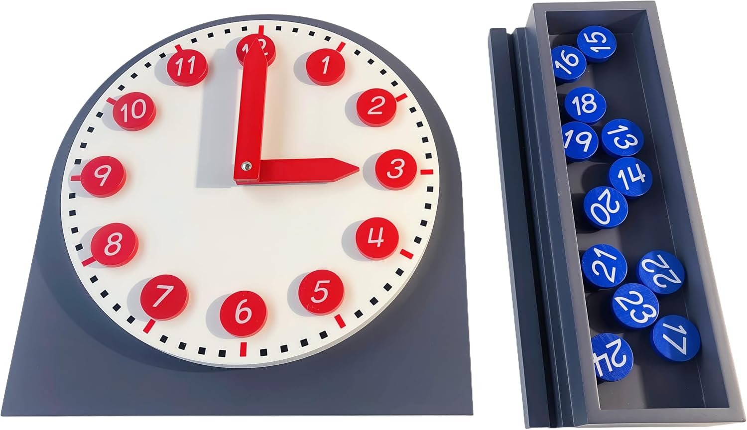 | Educational Objective | 1. Master analog time-telling through direct, hands-on manipulation of clock components., 2. Strengthen fine motor skills and hand-eye coordination by placing numbers and moving clock hands., 3. Build foundational math skills, including number order, sequencing, and cyclical patterns., 4. Foster independent problem-solving and concentration using the self-correcting, child-led design., 5. Develop cognitive understanding of daily routines and time management as a practical life skill. |