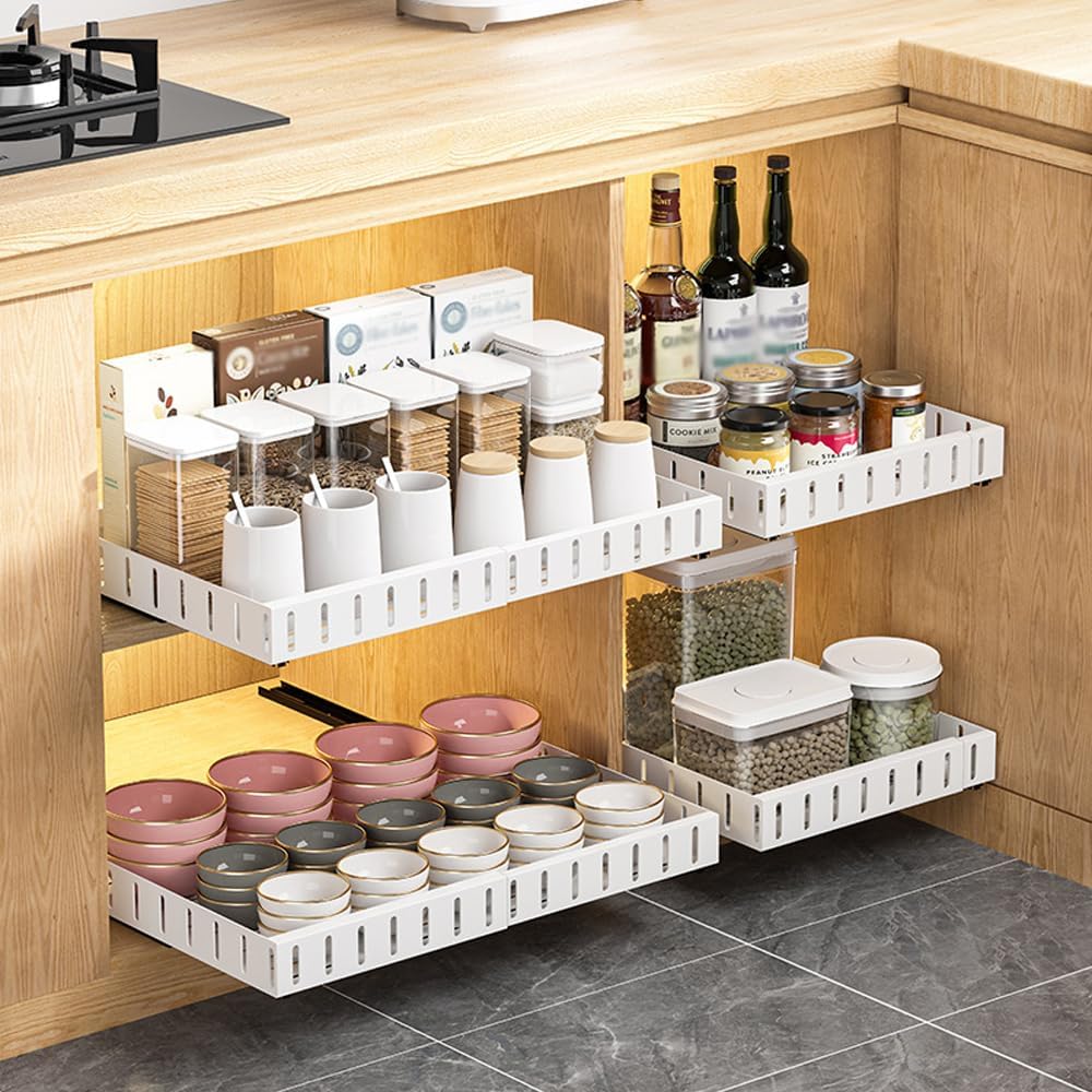 Features: 1. Expandable pull out drawer cabinet organize versatile cabinet organizer for every need - elevate your organization today! 2. Pull out cabinet organizers make you access pots, pans, lids, bottles, stand mixers, and other kitchen accessories easier. 3. Pull out drawers for cabinets can help you organize your space better. 4. Expandable pull out cabinet organizer can be applied to multiple scenarios such as kitchen, bathroom, bedroom, etc. Specification: Material: Carbon Steel Color: White Sizes: Pre-expansion:40*30*5.5cm/15.75*11.81*2.17in Post-retractable: 40*50*5.5cm/15.75*19.69*2.17in Package Included: 1* Pull Out Cabinet Organizer Notes: 1. Dimensions are measured manually, please allow slight errors. 2. Color may vary slightly from the online image due to your monitor color settings, please refer to the actual product, and thank you for your understanding.