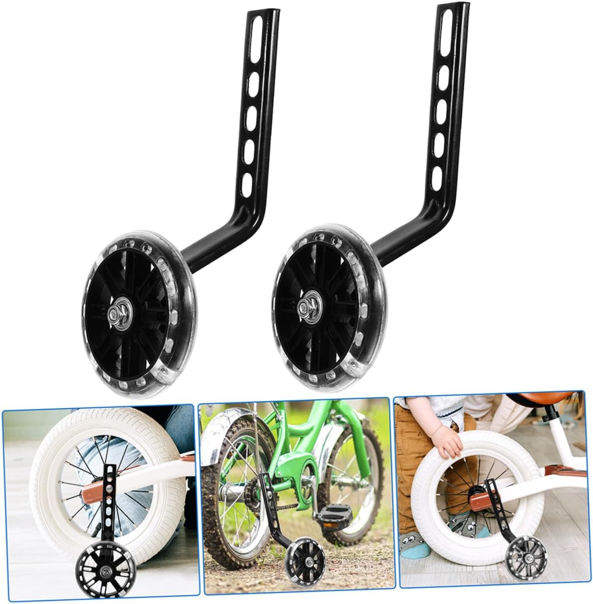 Package List 2 x Pairs of Training Wheels Features -Size:10.50X10.50X2.00cm/4.13X4.13X0.79in -Product Info: bicycle assist wheel -Material:Iron, PP, aluminium alloy -Color:Black -Professional and practical design with beautiful appearance, easy to install and use cycling bike safety trainer. -Thicker than the ordinary training wheel and added a small bracket that it's more stable bike stabilisers for childs bikes. -This bike stabilizers assist learners until they have developed a usable sense of balance stabilisers. -Anti-slip, wear resistant, providing stability and help to ride a bike without training wheels bike stabilisers -The wheel is designed with the sturdy construction, more safe for your support wheels.Goods Description bike supplies What's more, your will like this when they are training bike.bike auxiliary wheel And this set can be your ' helper. bike accessories A great tool for your first cycling lesson!.stabilisers These rear wheels provide the necessary safety and stability.wheel stabilisers This is a bike training wheel, made of good material, and it is easy to install