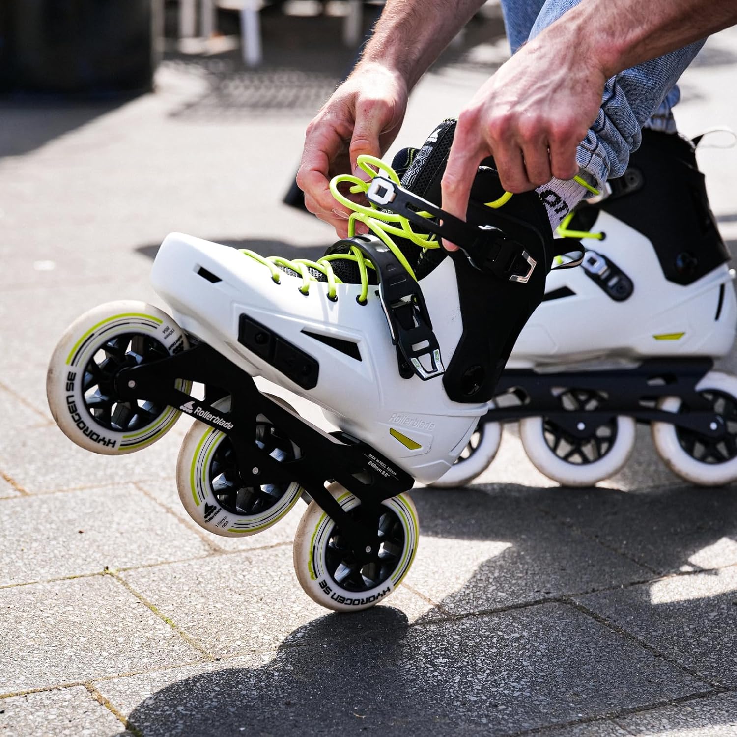 You are looking for a versatile and fast urban skate. The Lightning 110 meets all the criteria. Engineered on the premises: grip, comfort and versatility, the Lightning is your go-to skate. The Lightning 110 has been developed for all skate inserts and is equipped with an anatomical and sublimated liner. In combination with refined eyelets and its PSI footbed, it ensures ideal support. This shell shoe is robust, provides support and ensures speed and performance. It impresses with its great combination of first-class fit, optimal hold and sensational manoeuvrability, whether for commuting or just cruising. Refined padding protects the feet. The sublimated inner lining nestles perfectly around the foot, providing greater breathability and shock absorbing cushioning in the heel area. This skate comes with the perfectly positioned 3x110 rail set-up. Features: - Liner: quick arrow, complete lacing, PSI footbed, footboard sizer to adjust the fit. - Rails: 3WD extruded aluminium (max. 110 mm) 248 mm/9.7 inches (sizes 220-270), 255 mm/10 inches (280-300), 270 mm/10.6 inches (310-320) racing axles, laterally adjustable. - Wheels: Hydrogen SE 110 mm/85A. - Bearings: SG9. - Brake: included in box contents. - Closure: memory cuff buckle, 45° closure, laces