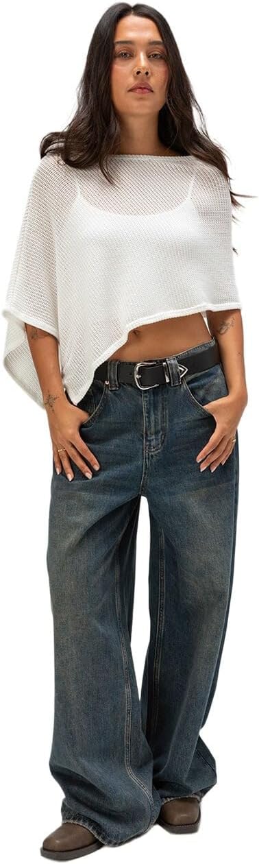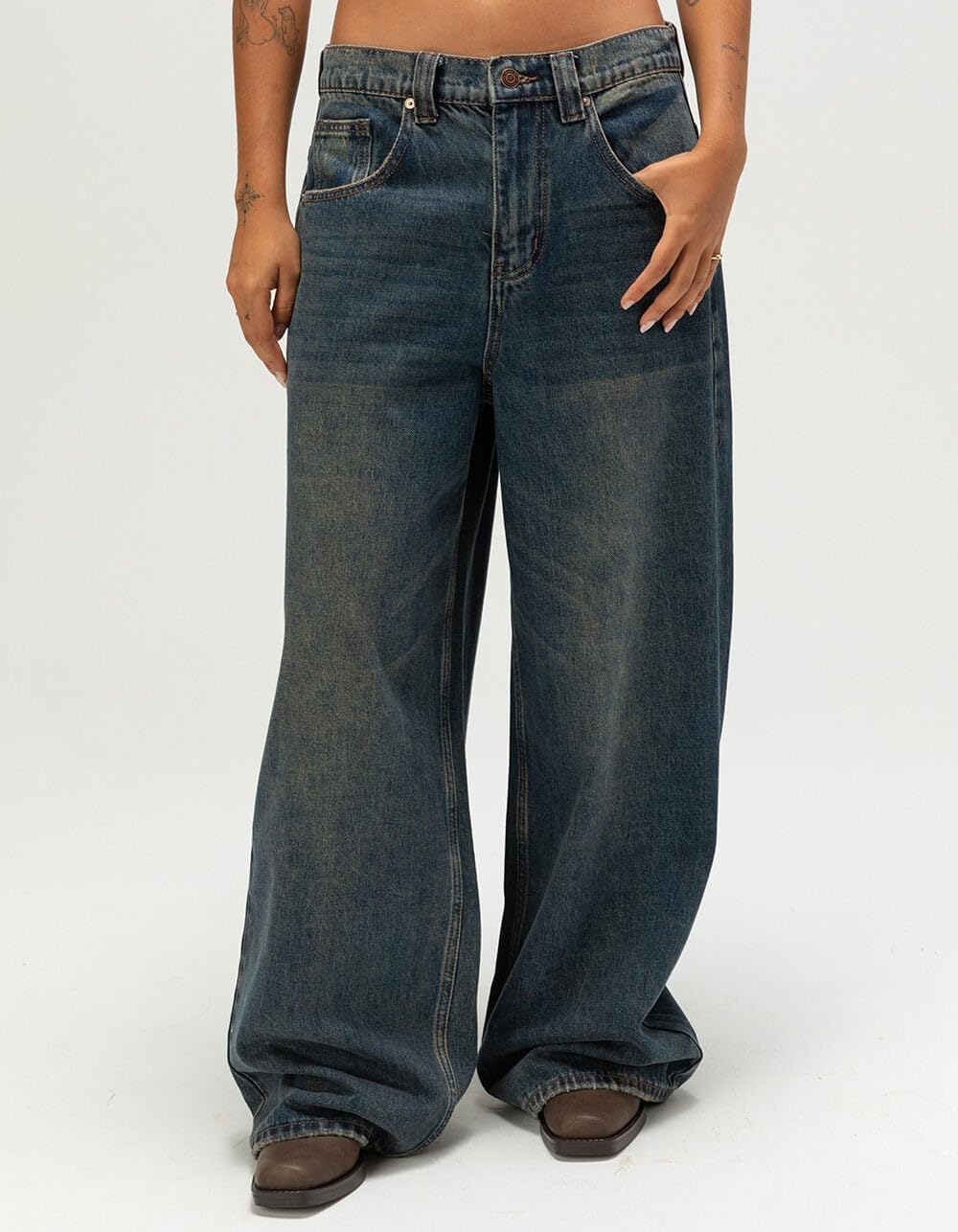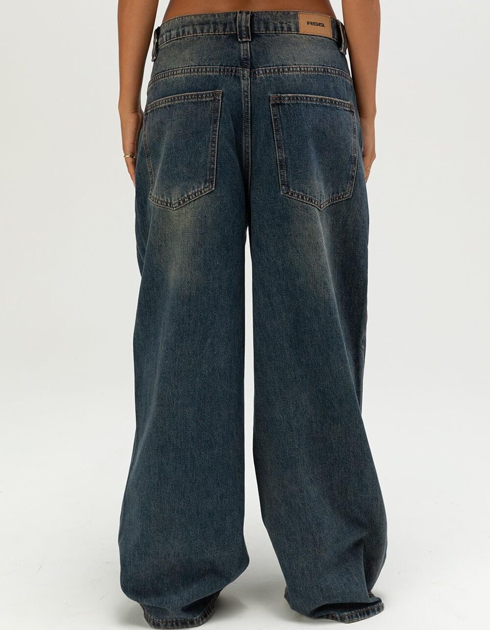 RSQ Low Rise Ultra Baggy Jeans. The RSQ Low Rise Ultra Baggy Jeans for women bring bold, relaxed style to your denim collection. Designed in a dark vintage wash, these jeans feature a low-rise waist with a classic 5-pocket design, button closure, and zip fly. The ultra baggy fit, complete with an approximate 22" leg opening, delivers a statement-making silhouette, while slight fraying adds a lived-in, edgy touch. With belt loops for styling versatility, these jeans pair perfectly with cropped tops or oversized hoodies for effortless street-ready vibes. 88% Cotton 8% Polyester 4% Rayon. Machine wash. Imported.
