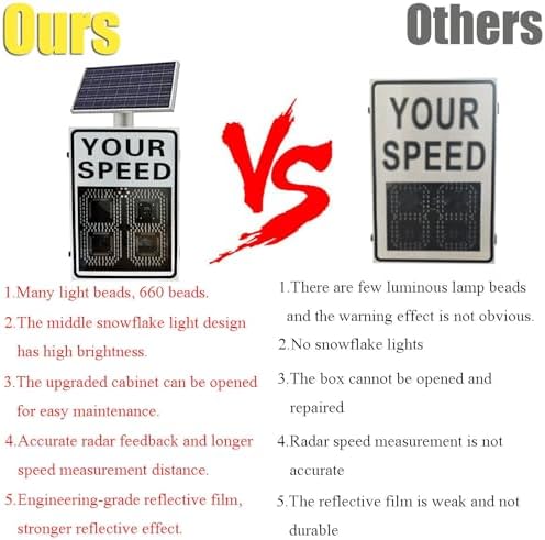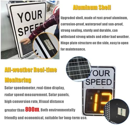Enhance road safety and improve traffic flow with our Solar Speed Radar Sign, available in two sizes: 20"x27" and 24"x35". This advanced speed display radar traffic sign is designed to effectively communicate speed limits to drivers, ensuring compliance and reducing the risk of accidents. Constructed with an upgraded aluminum shell, our radar speed meter is built to withstand harsh weather conditions. Its anti-corrosion, waterproof, and sun-proof features ensure durability, while the strong sealing provides pressure and wear resistance. The innovative hinge plate structure allows for easy access during maintenance, and the included key helps protect radar data from unauthorized changes. Our radar sign utilizes super reflective film, providing high brightness reflection at night for enhanced visibility. The dual-color red and green LED lamp beads not only deliver high brightness but also consume less energy, making it an eco-friendly choice. With real-time monitoring around the clock, you can trust that this speed measurement sign will keep your roads safer at all times. Installation is straightforward with our U-shaped hoop, compatible with standard 76/89 mounts, and customizable options are available. The radar speed sign operates effectively within a speed range of 2-99 MPH, ensuring that it meets diverse traffic management needs. With a visual distance exceeding 800 meters and a working temperature range of -40℃ to 70℃, this speed display sign is designed for longevity, boasting a service life of over 100,000 hours. Your package includes a radar speed sign, solar panel, remote control, key, and a complete installation accessory set. For optimal performance, ensure the solar panel is calibrated to receive maximum sunlight during installation. Choose our Solar Speed Radar Sign today to enhance safety and promote responsible driving in your community. Should you have any questions, feel free to reach out to us via email for assistance. Your satisfaction...