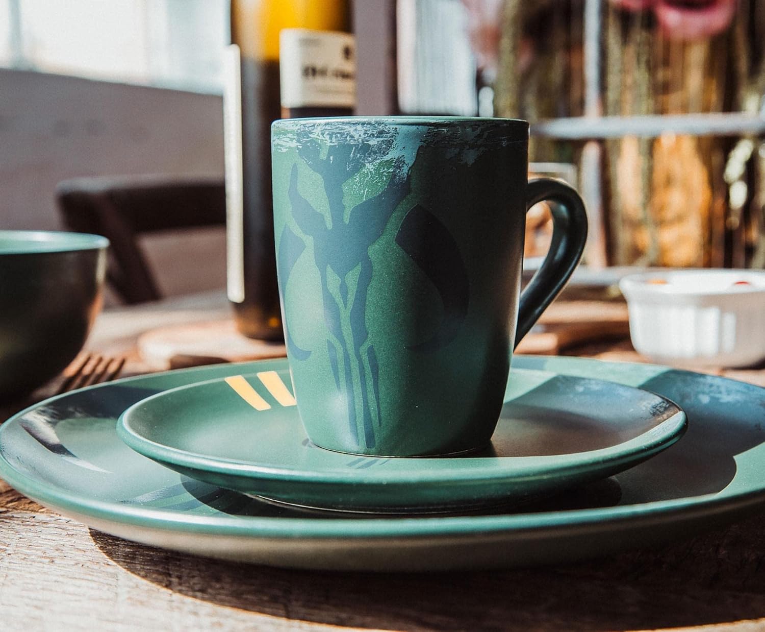 A 3-COURSE STAR WARS EXPERIENCE Commissioned for the legendary Boba Fett, this Mythosaur dining set features the skull of the legendary Mythosaur which is worn by Boba Fett. This 4-piece set includes quality stoneware plates, a bowl, and a mug - everything you need for a delicious 3-course meal! Dine with the legacy of the mighty Boba Fett with these incredibly durable dishes. Each piece of dinnerware is designed to wow yourself and your dinner guests. Whether you're dining for one or eating at Jabba's royal palace, these plates are a must-have for any Star Wars fan. SERVE UP SOME PASSION WITH EVERY DISH When it comes to dining, why not transport yourself to a new world where your passions will blend with practicality? With this decorative dining set, you can now enjoy your favorite meals with your favorite pieces of entertainment. Indulge the most delicious foods while each bit of your dinnerware is showcased with the mighty Mythosaur skull. One can't help but think about the Mandalorian or the infamous Boba Fett as the Mythosaur skull is adorned by both armor-clad bounty hunters. Share your passions with your friends and family while serving up your favorite dishes on this Star Wars Mythosaur dinnerware set.