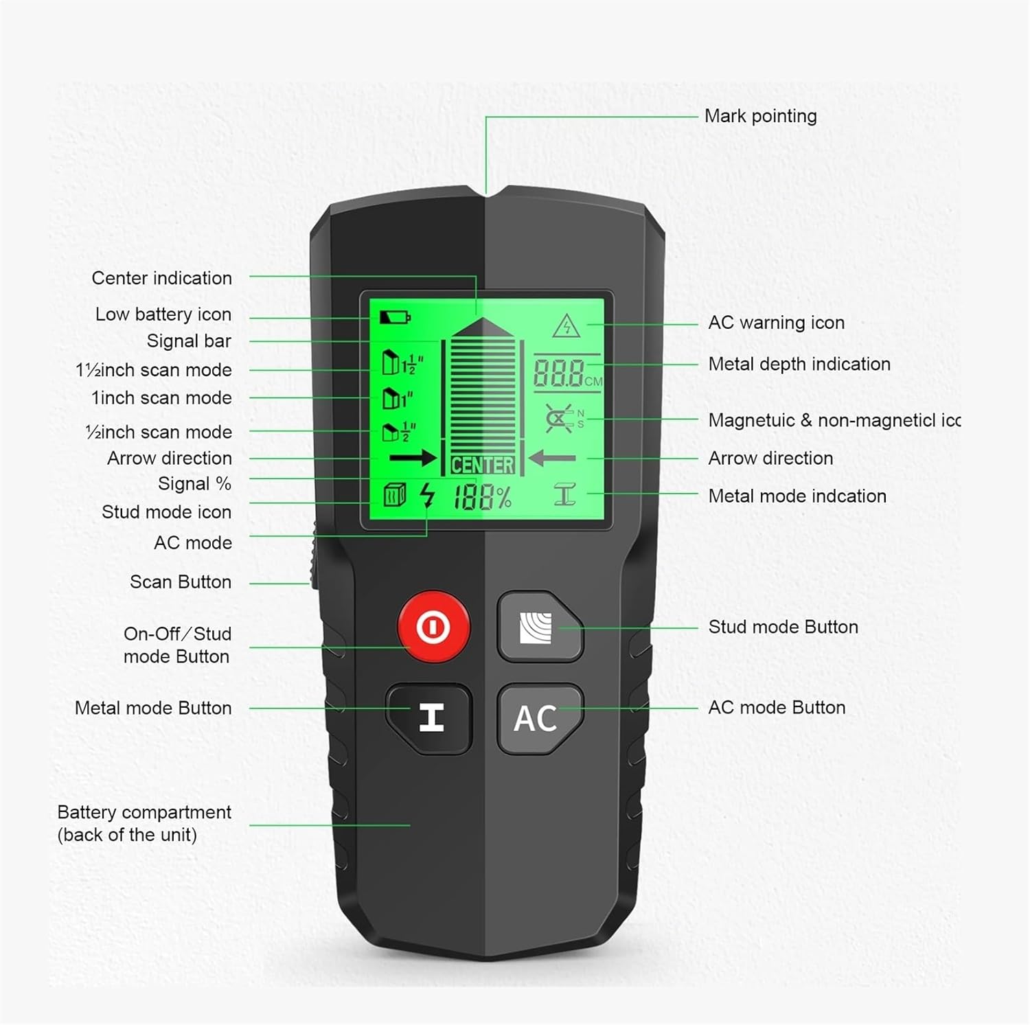 1. The wall stud finder can accurately and quickly find the edge and center of metal, studs, joists, pipes and live AC wires behind walls, floors and ceilings. Rapid detection saves users time and energy, making task completion easier.2. High visibility and comprehensive display, equipped with a bright backlit LCD display, which can show the center, edge and position of the detected studs and battery status.3. Multiple scanning modes, providing multiple scanning modes including stud scanning, depth scanning and metal scanning, allowing you to detect a variety of materials and depths.Specification:Battery Type: Built in lithium battery<;50ma<;10UAAutomatic Shutdown Time: 3 minutesFeature:1/2" Stud Scan Mode: Detects wood or metal studs up to 13mm deep1" Stud Scan Mode: Detects wood or metal studs up to 25mm deep1 1/2" Stud Scan Mode: Detects wood or metal studs up to 38mm deepMetal Mode: Detects metal up to 80mm for magnetic(60mm for non-magnetic)AC Mode: Detects live unshielded AC wires up to 51mm deepMetal Depth Indicator.Green Backlight.Low Voltage Indicator.Fine workmanship and good performance.Easy to use.Long service life.Package Included:1 x Wall Scanner