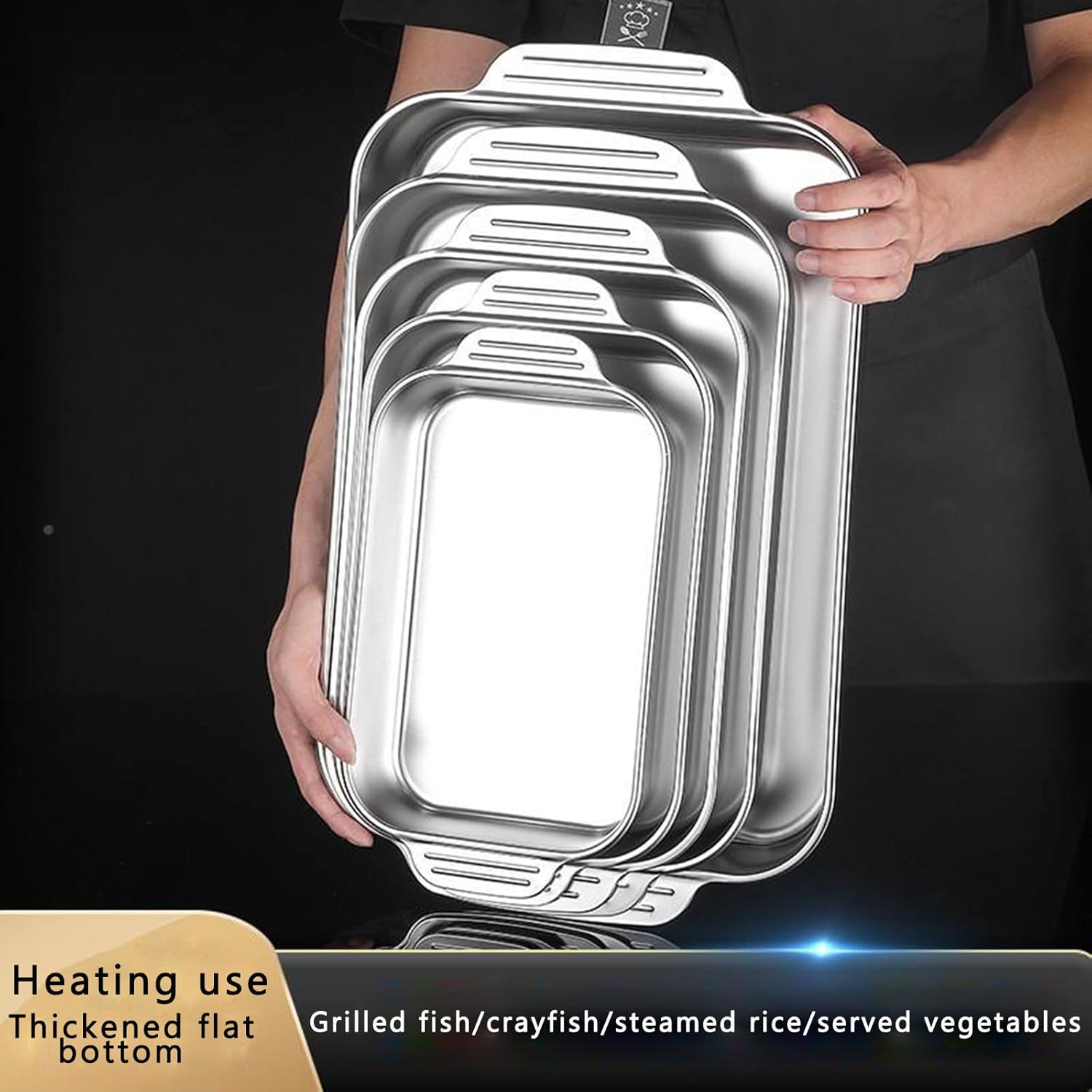Perfect for casseroles, stews, lasagna, brownies, cookies and all your favorite savory or sweet dishes! Looking for new baking dishes, these will do quite nicely. Wide roasting pan handles offer a comfy grip, even with bulky oven mitts on or when using the roaster as a turkey pan. Available in 5 sizes, 3.1L/3.4L/5.8L/7.4L/10L. Suitable for family kitchen, hotel, restaurant and so on. It a great gift for anyone in birthday, wedding, thanksgiving, christmas or house-warming. Product Parameters: Name: Stainless steel grilled fish plate Material: high quality stainless steel Use: grilled fish / baking / serving dishes Size: 33cm: 28x18.7x7.6cm/11.02x7.36x2.99inch, capacity: 3.1L 37cm: 31x21.8x8cm/12.2x8.58x3.15inch, Capacity: 3.4L 41cm: 34.5x24.2x8.4cm/13.58x9.52x3.3inch, Capacity: 5.8L 45cm: 39x27.5x8.8cm/15.35x10.82x3.46inch, Capacity: 7.4L 51cm: 44x31.5x8.5cm/17.32x12.4x3.34inch, Capacity: 10L Attention: All sizes are measured by hand, please allow for minor differences